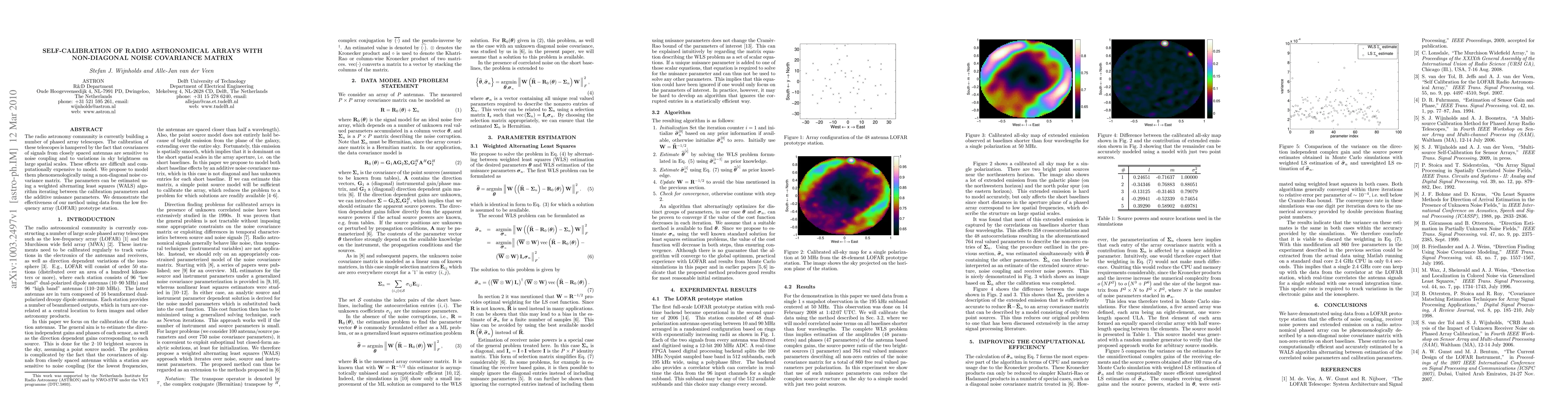 This paper proposes a method to self-calibrate radio astronomical arrays by modeling noise covariances using a non-diagonal matrix, addressing challenges from noise coupling and sky brightness variations. The method employs a weighted alternating least squares algorithm to estimate parameters and is validated using LOFAR data.
