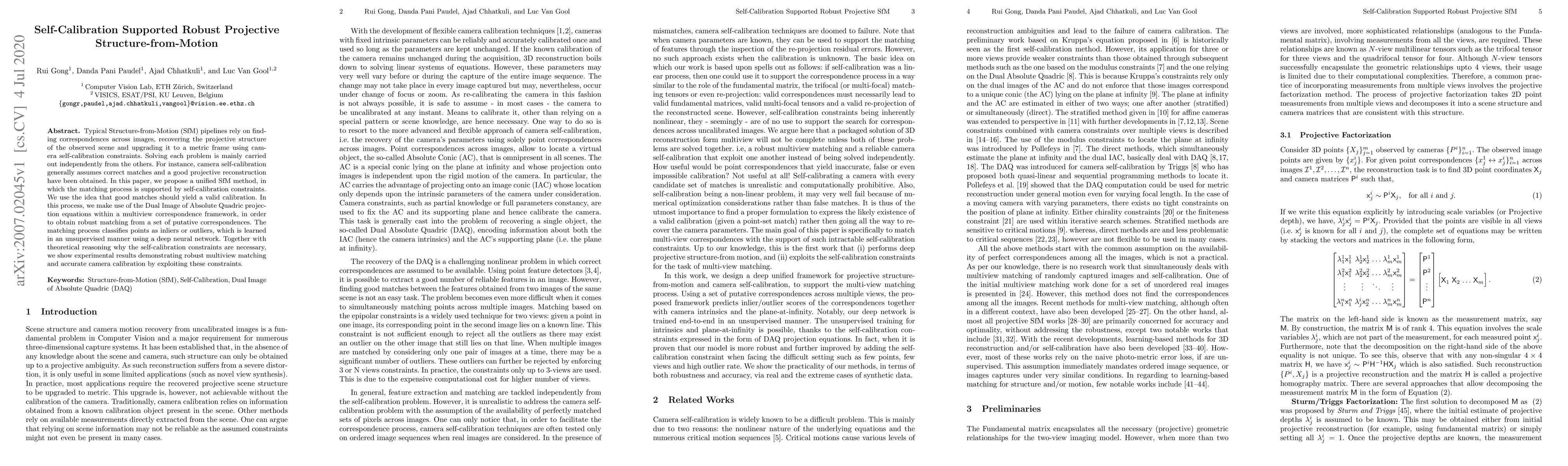 This paper proposes a unified Structure-from-Motion (SfM) method that integrates self-calibration constraints into the matching process, using a deep neural network for robust multiview correspondence classification. The method leverages the Dual Image of Absolute Quadric projection equations to achieve accurate camera calibration and robust matching.