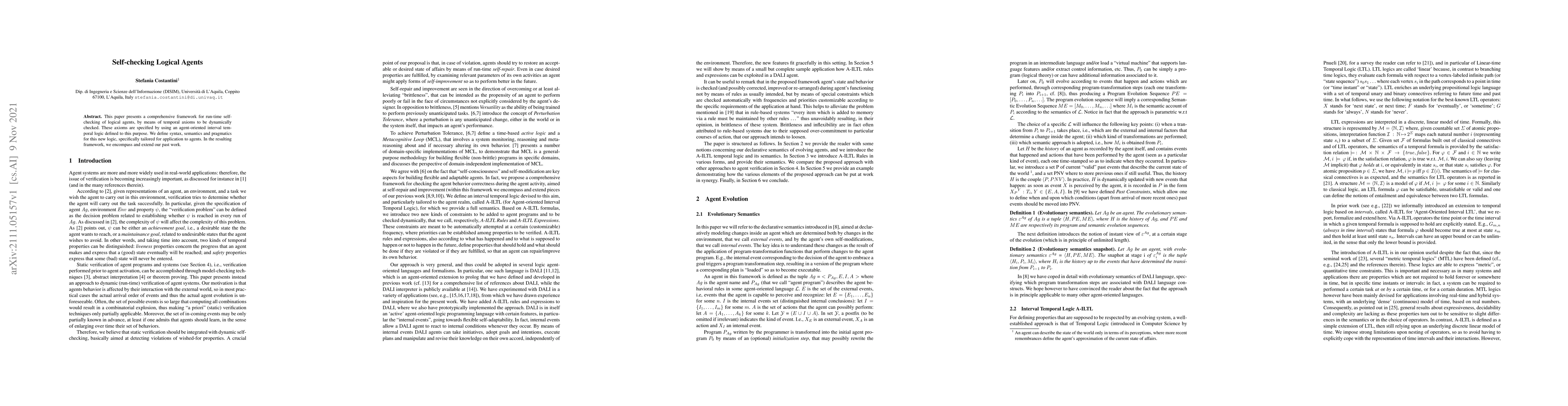 This paper presents a comprehensive framework for run-time self-checking of logical agents, by means of temporal axioms to be dynamically checked. These axioms are specified by using an agent-oriented interval temporal logic defined to this purpose. We define syntax, semantics and pragmatics for this new logic, specifically tailored for application to agents. In the resulting framework, we encompass and extend our past work.