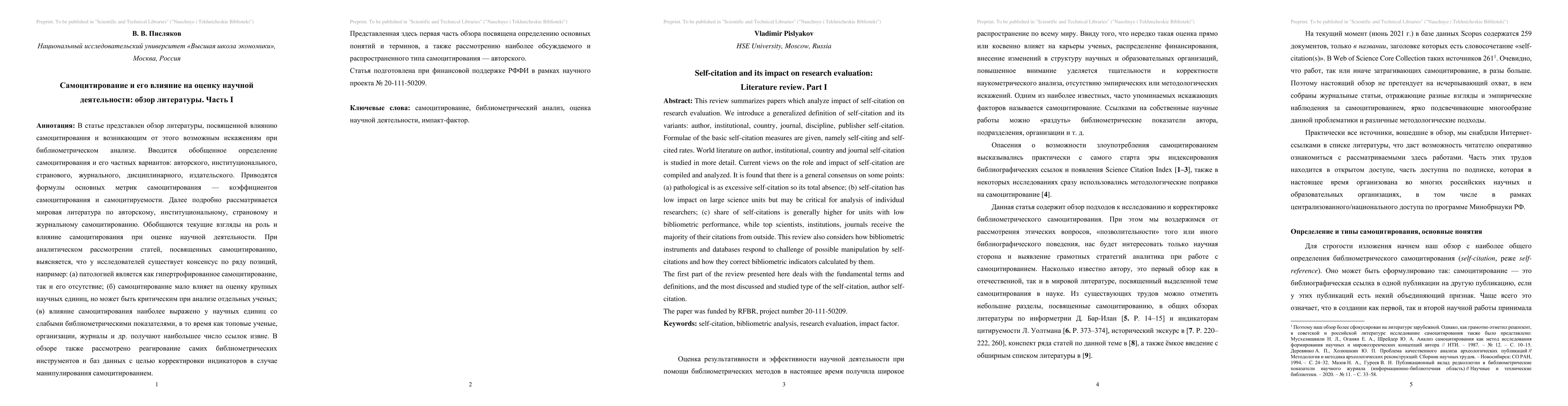This review examines the impact of self-citation on research evaluation, defining various types and presenting measures like self-citing and self-cited rates. It finds that while self-citation can be excessive or absent pathologically, it has minimal impact on large science units but is significant for individual researchers. The paper funded by RFBR focuses on fundamental terms and author self-citation.