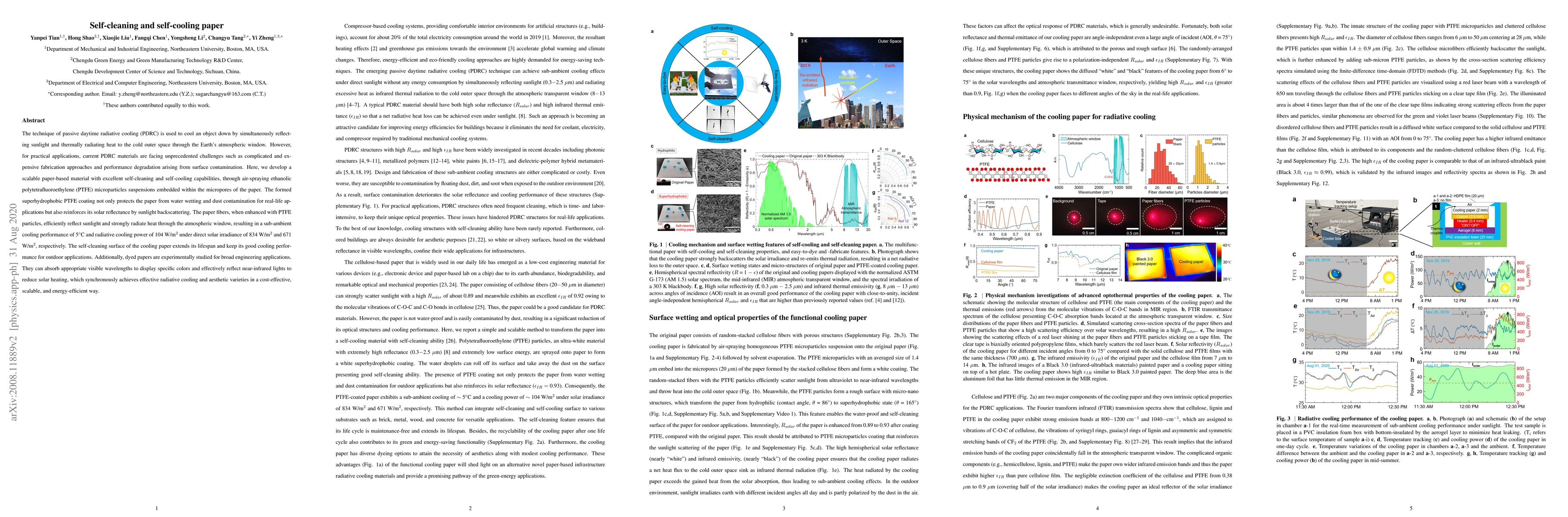 The technique of passive daytime radiative cooling (PDRC) is used to cool an object down by simultaneously reflecting sunlight and thermally radiating heat to the cold outer space through the Earth's atmospheric window. However, for practical applications, current PDRC materials are facing unprecedented challenges such as complicated and expensive fabrication approaches and performance degradation arising from surface contamination. Here, we develop a scalable paper-based material with excellent self-cleaning and self-cooling capabilities, through air-spraying ethanolic polytetrafluoroethylene (PTFE) microparticles suspensions embedded within the micropores of the paper. The formed superhydrophobic PTFE coating not only protects the paper from water wetting and dust contamination for real-life applications but also reinforces its solar reflectance by sunlight backscattering. The paper fibers, when enhanced with PTFE particles, efficiently reflect sunlight and strongly radiate heat through the atmospheric window, resulting in a sub-ambient cooling performance of 5$^{\circ}$C and radiative cooling power of 104 W/m$^2$ under direct solar irradiance of 834 W/m$^2$ and 671 W/m$^2$, respectively. The self-cleaning surface of the cooling paper extends its lifespan and keep its good cooling performance for outdoor applications. Additionally, dyed papers are experimentally studied for broad engineering applications. They can absorb appropriate visible wavelengths to display specific colors and effectively reflect near-infrared lights to reduce solar heating, which synchronously achieves effective radiative cooling and aesthetic varieties in a cost-effective, scalable, and energy-efficient way.