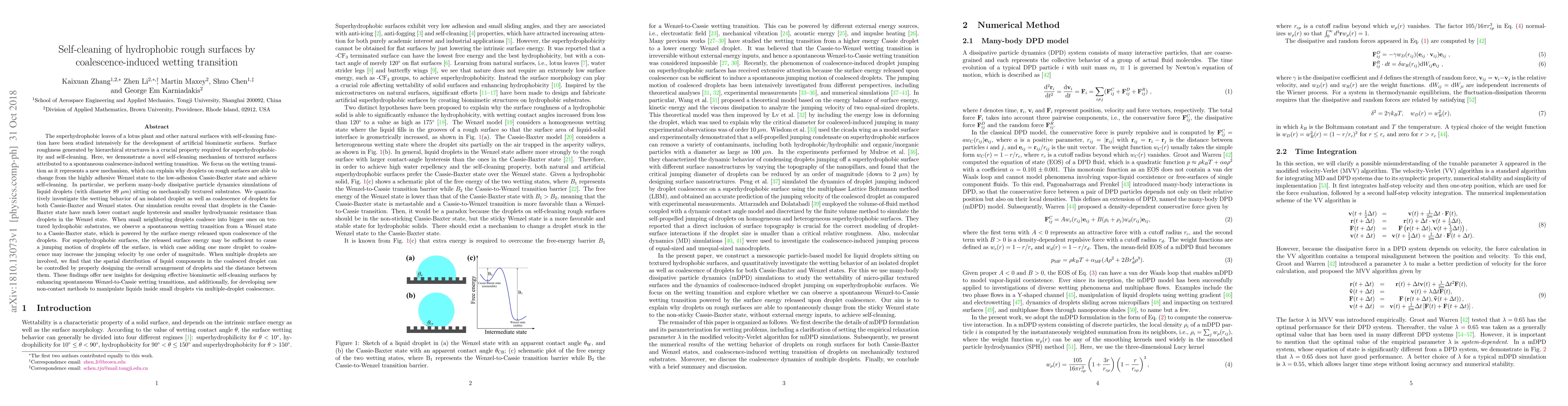 This research presents a novel self-cleaning mechanism on hydrophobic rough surfaces, driven by a coalescence-induced wetting transition from the Wenzel to Cassie-Baxter state. Simulation results show that droplet coalescence can release sufficient energy to induce this transition, enhancing self-cleaning properties and potentially causing droplets to jump off the surface.