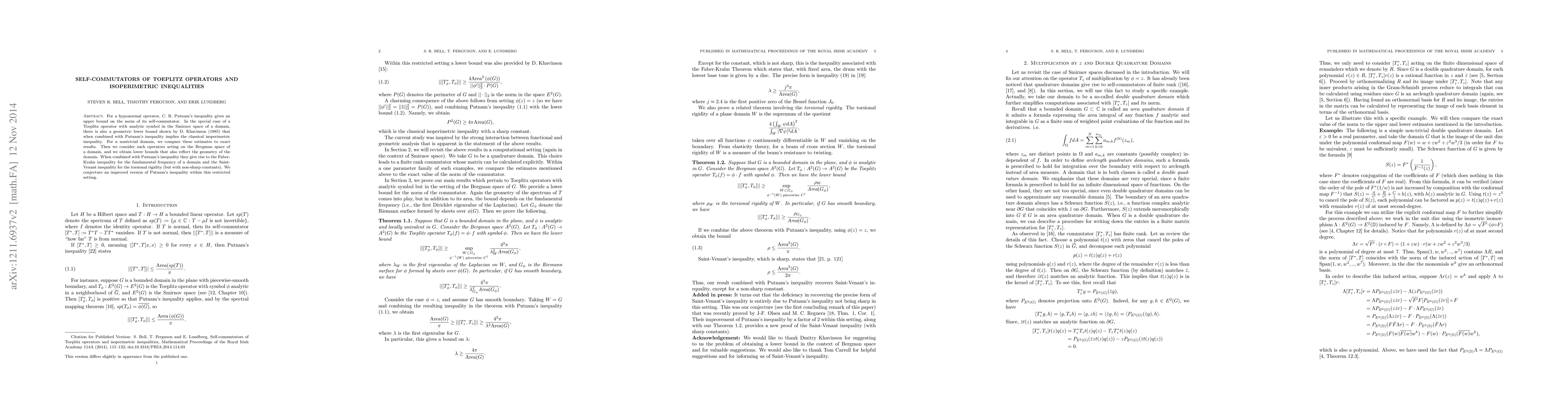 For a hyponormal operator, C. R. Putnam's inequality gives an upper bound on the norm of its self-commutator. In the special case of a Toeplitz operator with analytic symbol in the Smirnov space of a domain, there is also a geometric lower bound shown by D. Khavinson (1985) that when combined with Putnam's inequality implies the classical isoperimetric inequality. For a nontrivial domain, we compare these estimates to exact results. Then we consider such operators acting on the Bergman space of a domain, and we obtain lower bounds that also reflect the geometry of the domain. When combined with Putnam's inequality they give rise to the Faber-Krahn inequality for the fundamental frequency of a domain and the Saint-Venant inequality for the torsional rigidity (but with non-sharp constants). We conjecture an improved version of Putnam's inequality within this restricted setting.