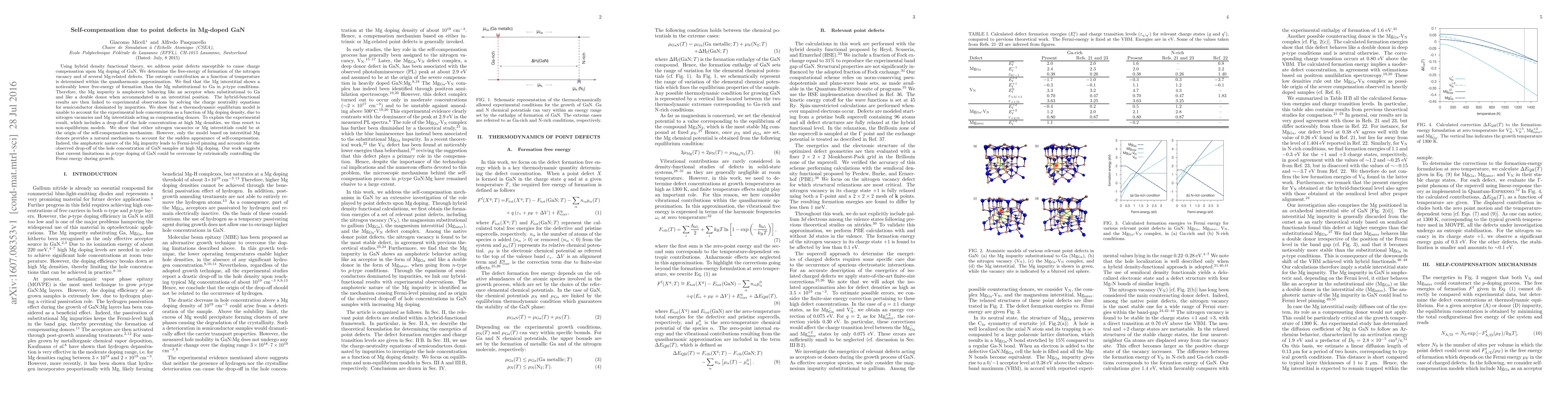This study uses hybrid density functional theory to investigate point defects in Mg-doped GaN, finding that Mg interstitials lower the free energy of formation compared to Mg substitutional defects. The research concludes that Mg impurities act as amphoteric donors, explaining the observed self-compensation and dropoff in hole concentration at high doping levels through nonequilibrium models.