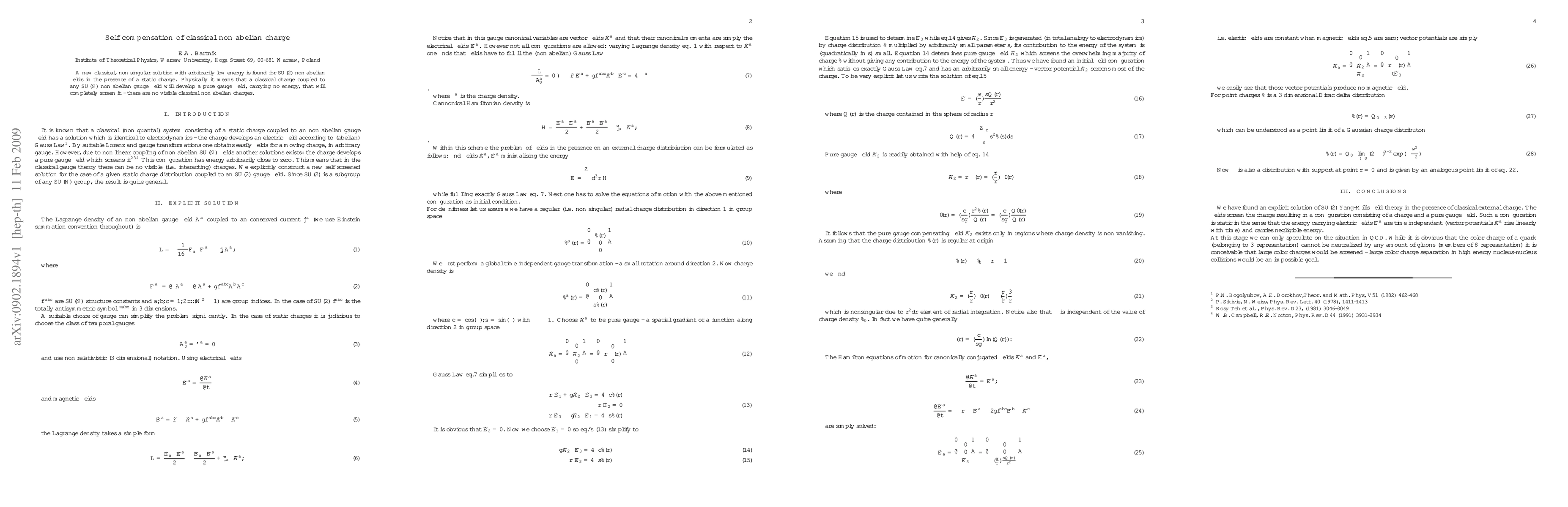 Summary: This paper presents a novel classical, low-energy solution for SU(2) non-abelian fields in the presence of a static charge, demonstrating self-compensation where the charge is completely screened by a pure gauge field, resulting in no visible classical non-abelian charge.