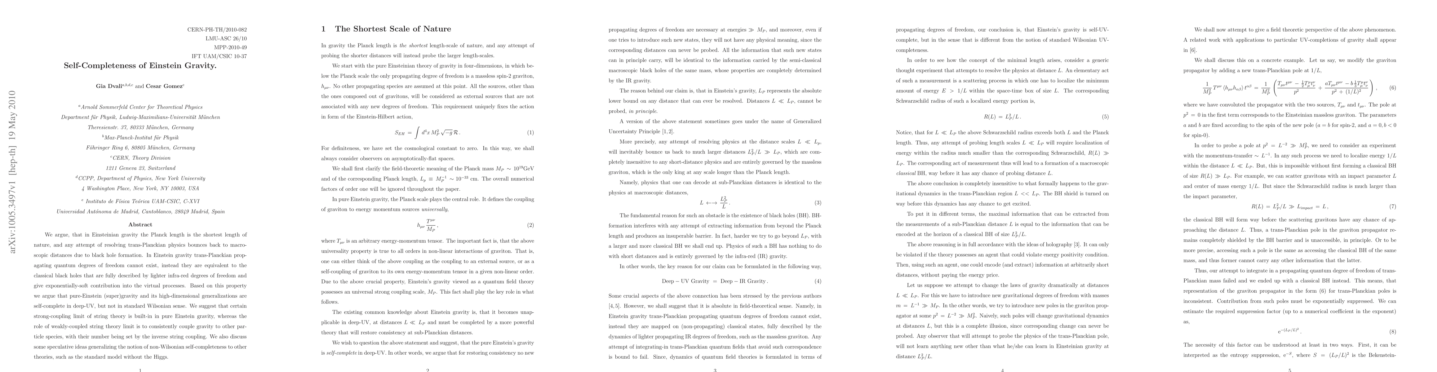 We argue, that in Einsteinian gravity the Planck length is the shortest length of nature, and any attempt of resolving trans-Planckian physics bounces back to macroscopic distances due to black hole formation. In Einstein gravity trans-Planckian propagating quantum degrees of freedom cannot exist, instead they are equivalent to the classical black holes that are fully described by lighter infra-red degrees of freedom and give exponentially-soft contribution into the virtual processes. Based on this property we argue that pure-Einstein (super)gravity and its high-dimensional generalizations are self-complete in deep-UV, but not in standard Wilsonian sense. We suggest that certain strong-coupling limit of string theory is built-in in pure Einstein gravity, whereas the role of weakly-coupled string theory limit is to consistently couple gravity to other particle species, with their number being set by the inverse string coupling. We also discuss some speculative ideas generalizing the notion of non-Wilsonian self-completeness to other theories, such as the standard model without the Higgs.