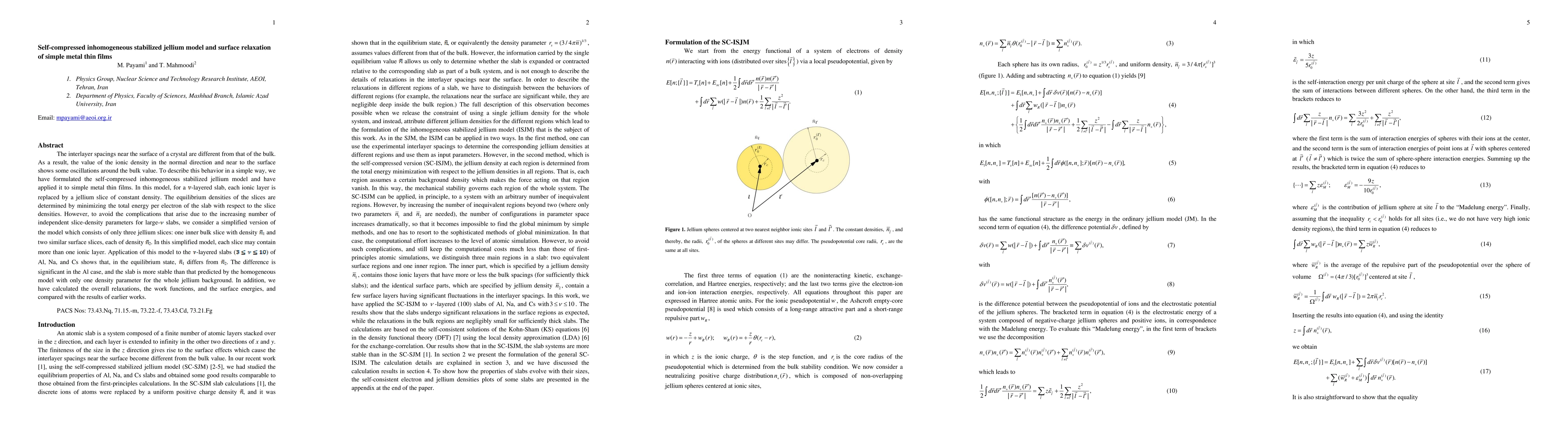 This paper introduces a self-compressed inhomogeneous stabilized jellium model to describe surface relaxation in simple metal thin films, showing that ionic densities near the surface oscillate around the bulk value. The model, applied to Al, Na, and Cs, reveals distinct densities for inner and surface layers, leading to a more stable equilibrium state compared to the homogeneous model.