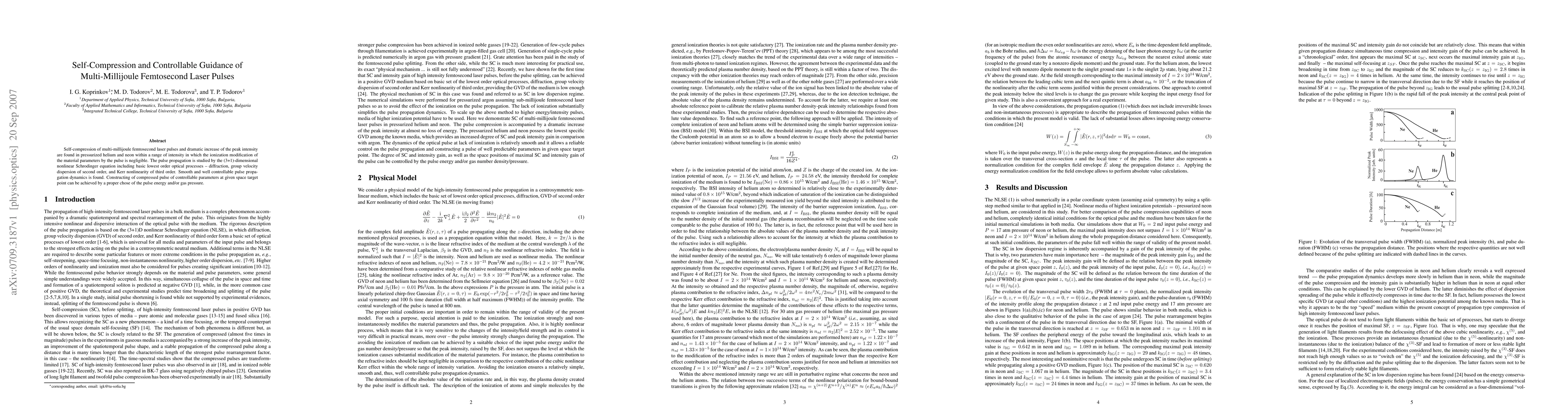 This paper investigates self-compression of multi-millijoule femtosecond laser pulses in pressurized helium and neon, achieving significant peak intensity increases without material ionization effects. The study employs a (3+1)-dimensional nonlinear Schrödinger equation to model pulse propagation dynamics, demonstrating smooth and controllable pulse behavior through the selection of pulse energy and gas pressure.