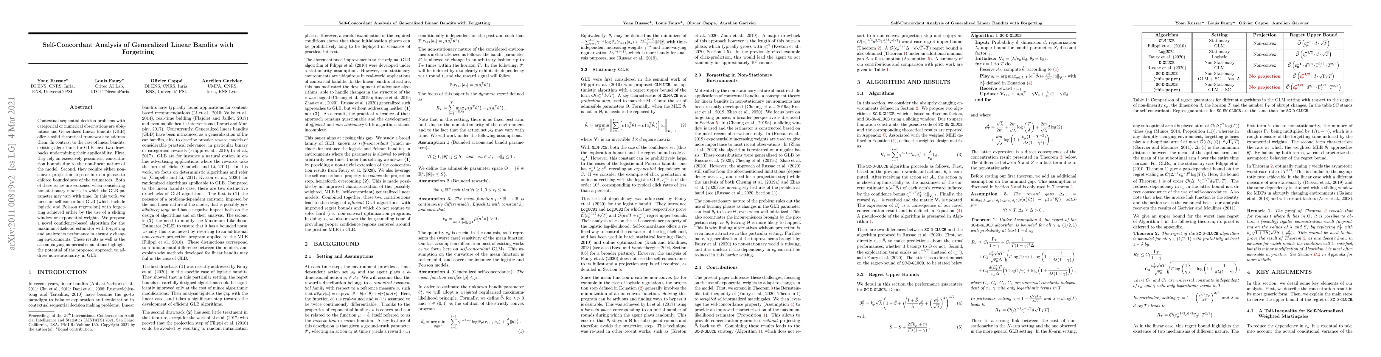 Contextual sequential decision problems with categorical or numerical observations are ubiquitous and Generalized Linear Bandits (GLB) offer a solid theoretical framework to address them. In contrast to the case of linear bandits, existing algorithms for GLB have two drawbacks undermining their applicability. First, they rely on excessively pessimistic concentration bounds due to the non-linear nature of the model. Second, they require either non-convex projection steps or burn-in phases to enforce boundedness of the estimators. Both of these issues are worsened when considering non-stationary models, in which the GLB parameter may vary with time. In this work, we focus on self-concordant GLB (which include logistic and Poisson regression) with forgetting achieved either by the use of a sliding window or exponential weights. We propose a novel confidence-based algorithm for the maximum-likehood estimator with forgetting and analyze its perfomance in abruptly changing environments. These results as well as the accompanying numerical simulations highlight the potential of the proposed approach to address non-stationarity in GLB.