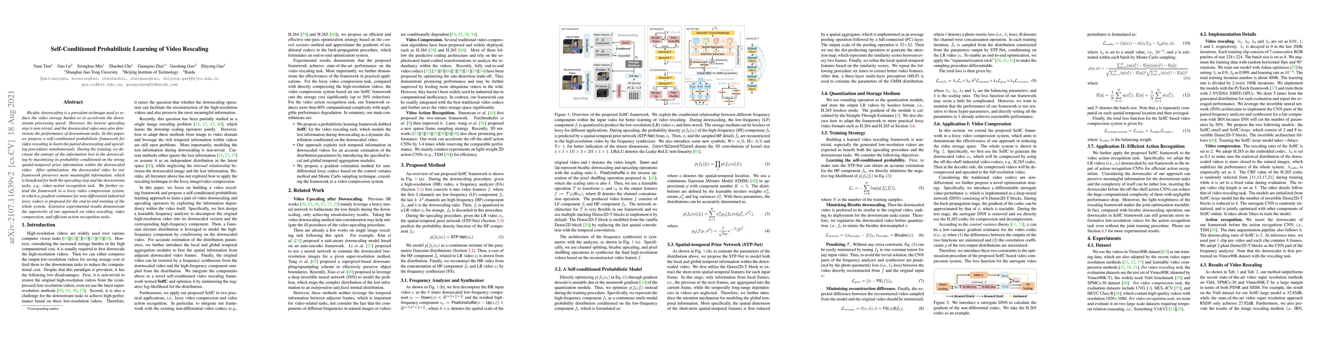 This paper proposes a self-conditioned probabilistic framework for video rescaling that simultaneously learns downscaling and upscaling processes. The method maximizes the probability of lost information conditioned on spatial-temporal priors, enhancing the quality of downscaled video for better upscaling and downstream tasks like action recognition.