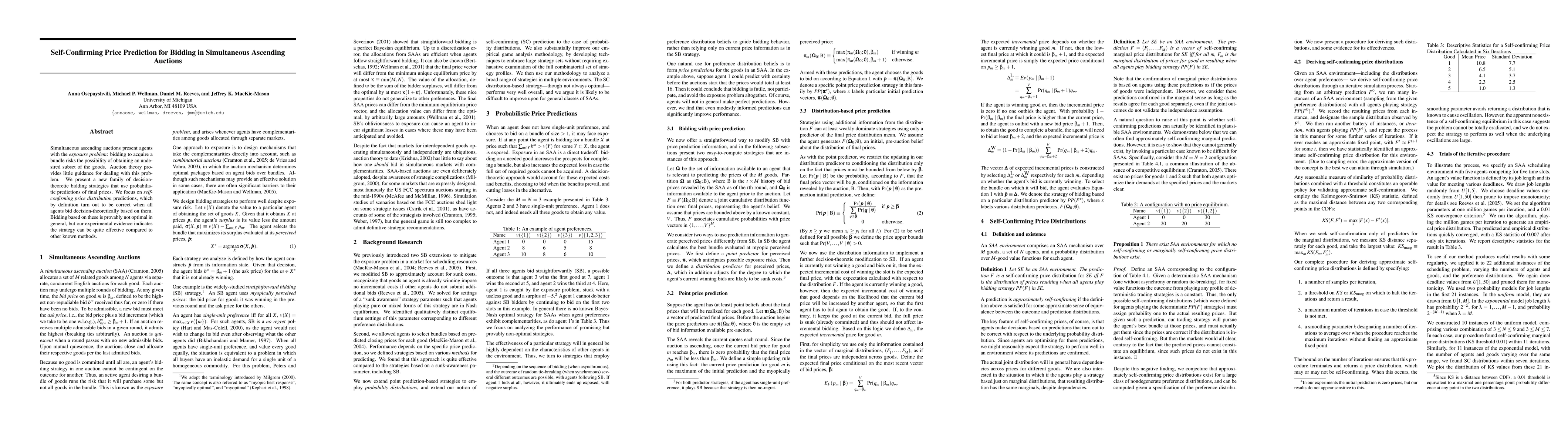 Simultaneous ascending auctions present agents with the exposure problem: bidding to acquire a bundle risks the possibility of obtaining an undesired subset of the goods. Auction theory provides little guidance for dealing with this problem. We present a new family of decisiontheoretic bidding strategies that use probabilistic predictions of final prices. We focus on selfconfirming price distribution predictions, which by definition turn out to be correct when all agents bid decision-theoretically based on them. Bidding based on these is provably not optimal in general, but our experimental evidence indicates the strategy can be quite effective compared to other known methods.