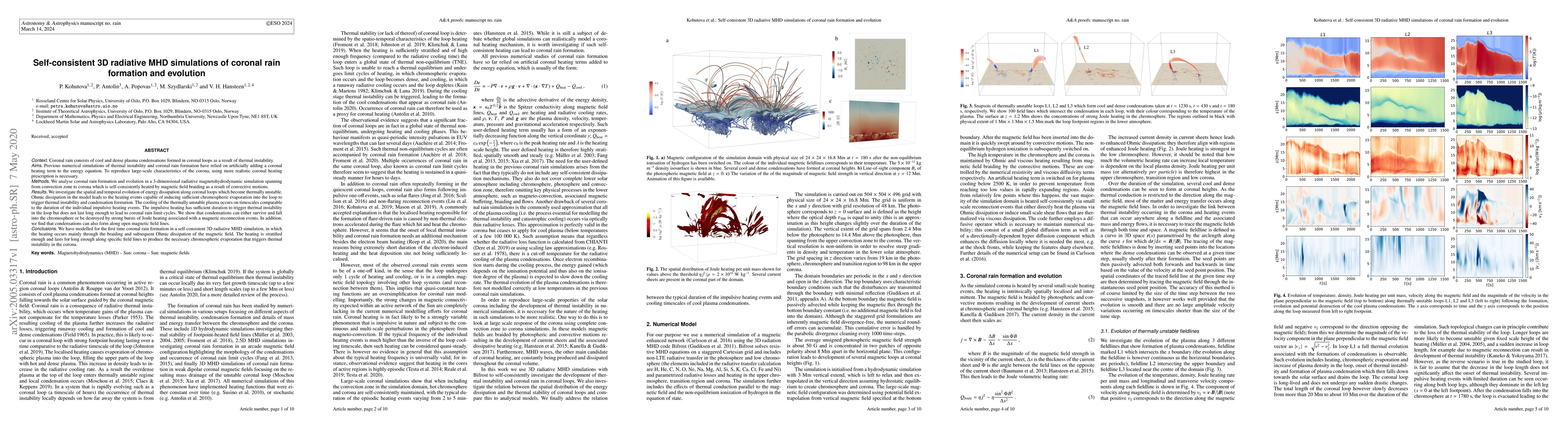 This paper presents self-consistent 3D radiative MHD simulations of coronal rain formation driven by magnetic field braiding and thermal instability, without artificially added heating terms. It finds that impulsive heating can trigger condensations that either fall into the chromosphere or are destroyed by magnetic reconnection events.