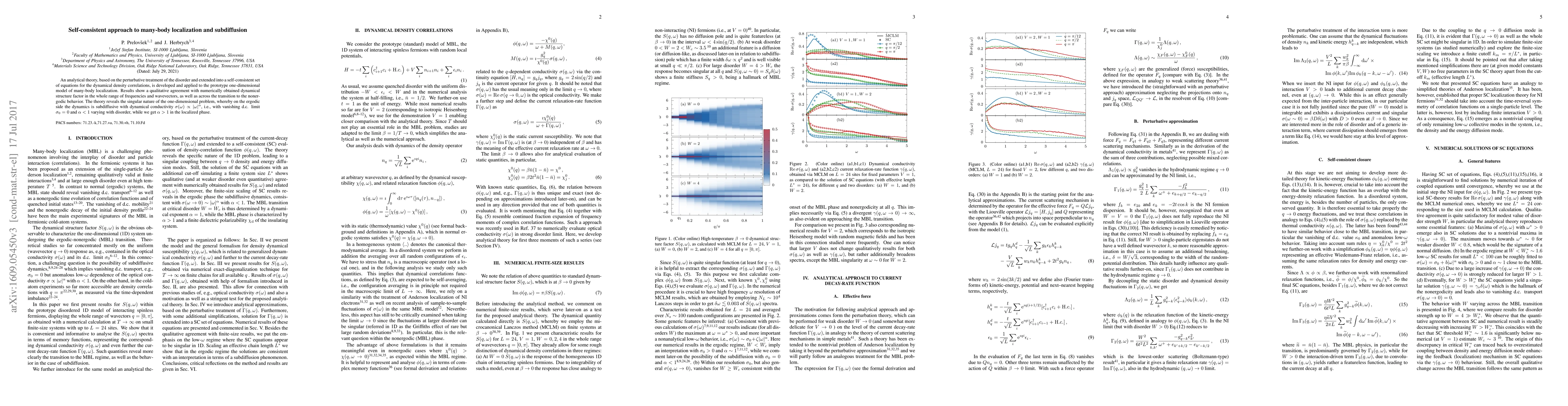 This paper develops a self-consistent analytical theory for many-body localization and subdiffusion in one-dimensional systems, showing agreement with numerical results. The theory reveals subdiffusive dynamics with $\sigma(\omega) \propto |\omega|^\alpha$ where $\alpha<1$ in the ergodic phase and $\alpha>1$ in the localized phase.