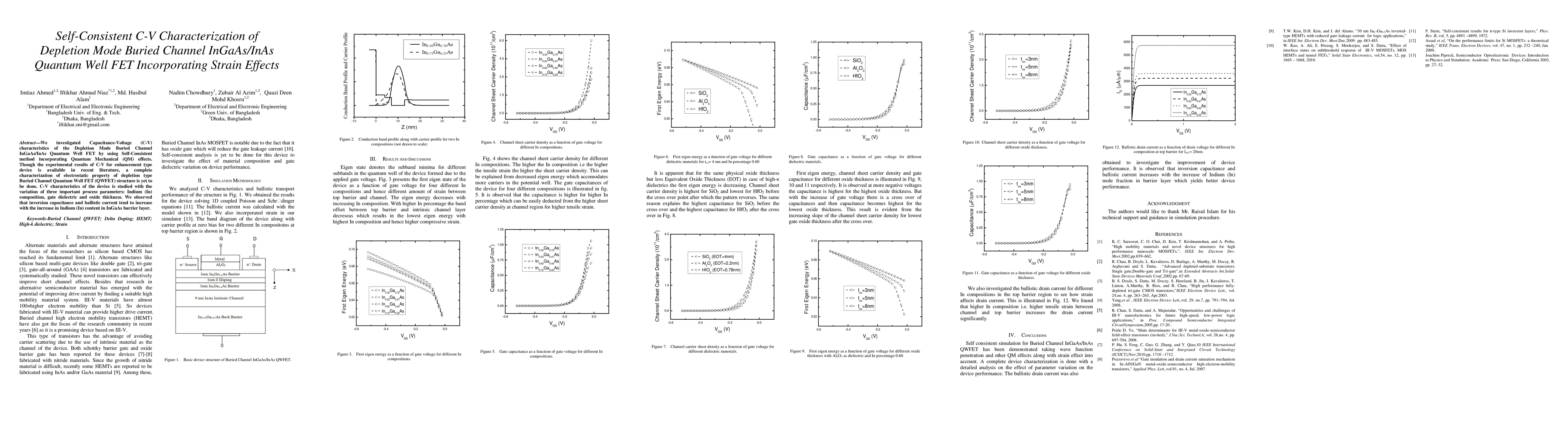 This paper presents a self-consistent C-V characterization of a Depletion Mode Buried Channel InGaAs/InAs Quantum Well FET, incorporating strain and quantum mechanical effects. The study reveals that inversion capacitance and ballistic current increase with higher Indium content in the InGaAs barrier layer.