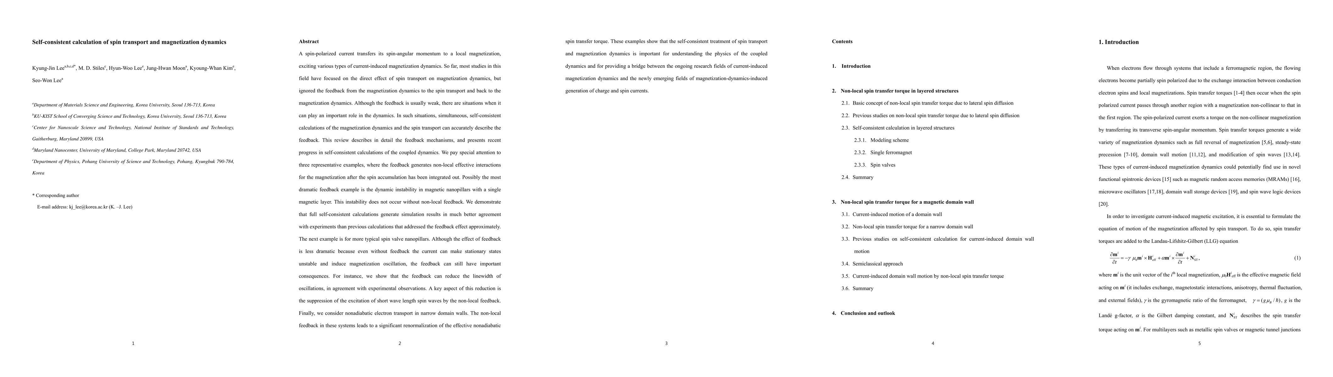 A spin-polarized current transfers its spin-angular momentum to a local magnetization, exciting current-induced magnetization dynamics. So far, most studies in this field have focused on the direct effect of spin transport on magnetization dynamics, but ignored the feedback from the magnetization dynamics to the spin transport and back to the magnetization dynamics. Although the feedback is usually weak, there are situations when it can play an important role in the dynamics. In such situations, self-consistent calculations of the magnetization dynamics and the spin transport can accurately describe the feedback. This review describes in detail the feedback mechanisms, and presents recent progress in self-consistent calculations of the coupled dynamics. We pay special attention to three representative examples, where the feedback generates non-local effective interactions for the magnetization. Possibly the most dramatic feedback example is the dynamic instability in magnetic nanopillars with a single magnetic layer. This instability does not occur without non-local feedback. We demonstrate that full self-consistent calculations generate simulation results in much better agreement with experiments than previous calculations that addressed the feedback effect approximately. The next example is for more typical spin valve nanopillars. Although the effect of feedback is less dramatic because even without feedback the current can induce magnetization oscillation, the feedback can still have important consequences. For instance, we show that the feedback can reduce the linewidth of oscillations, in agreement with experimental observations. Finally, we consider nonadiabatic electron transport in narrow domain walls. The non-local feedback in these systems leads to a significant renormalization of the effective nonadiabatic spin transfer torque.