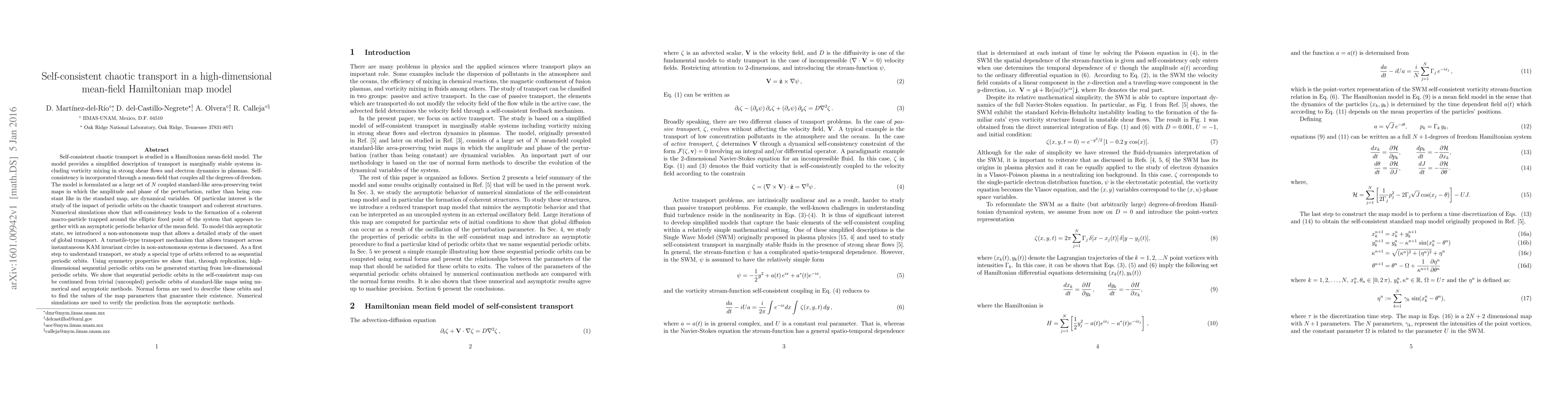 Self-consistent chaotic transport is studied in a Hamiltonian mean-field model. The model provides a simplified description of transport in marginally stable systems including vorticity mixing in strong shear flows and electron dynamics in plasmas. Self-consistency is incorporated through a mean-field that couples all the degrees-of-freedom. The model is formulated as a large set of $N$ coupled standard-like area-preserving twist maps in which the amplitude and phase of the perturbation, rather than being constant like in the standard map, are dynamical variables. Of particular interest is the study of the impact of periodic orbits on the chaotic transport and coherent structures. Numerical simulations show that self-consistency leads to the formation of a coherent macro-particle trapped around the elliptic fixed point of the system that appears together with an asymptotic periodic behavior of the mean field. To model this asymptotic state, we introduced a non-autonomous map that allows a detailed study of the onset of global transport. A turnstile-type transport mechanism that allows transport across instantaneous KAM invariant circles in non-autonomous systems is discussed. As a first step to understand transport, we study a special type of orbits referred to as sequential periodic orbits. Using symmetry properties we show that, through replication, high-dimensional sequential periodic orbits can be generated starting from low-dimensional periodic orbits. We show that sequential periodic orbits in the self-consistent map can be continued from trivial (uncoupled) periodic orbits of standard-like maps using numerical and asymptotic methods. Normal forms are used to describe these orbits and to find the values of the map parameters that guarantee their existence. Numerical simulations are used to verify the prediction from the asymptotic methods.