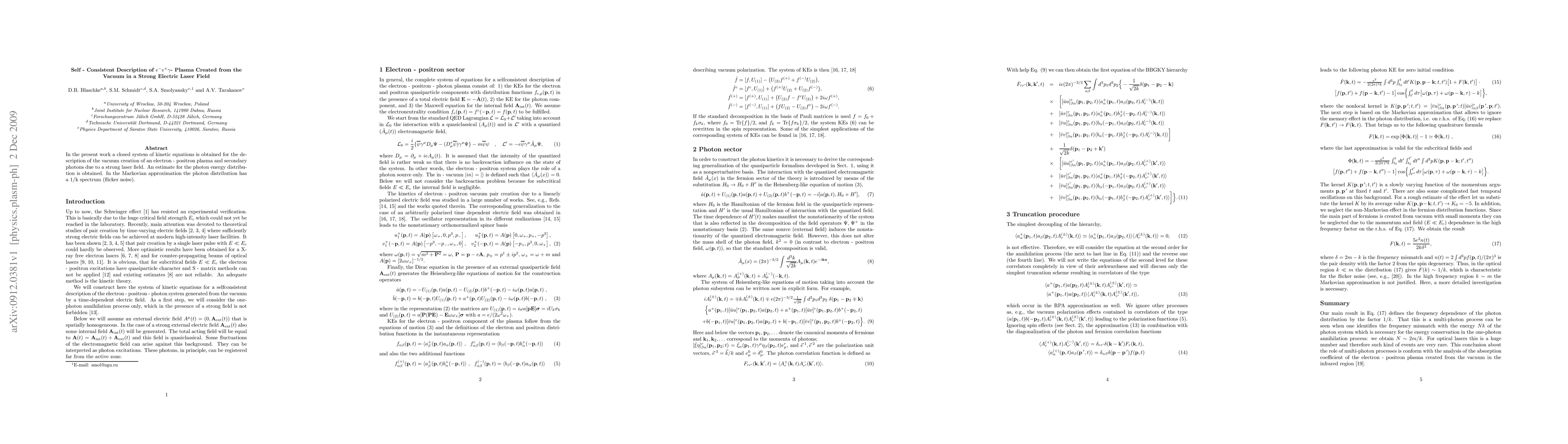 This paper develops a closed kinetic equation system to describe the vacuum creation of an electron-positron plasma and secondary photons under a strong laser field, finding that the photon energy distribution exhibits a 1/k spectrum (flicker noise) in the Markovian approximation.