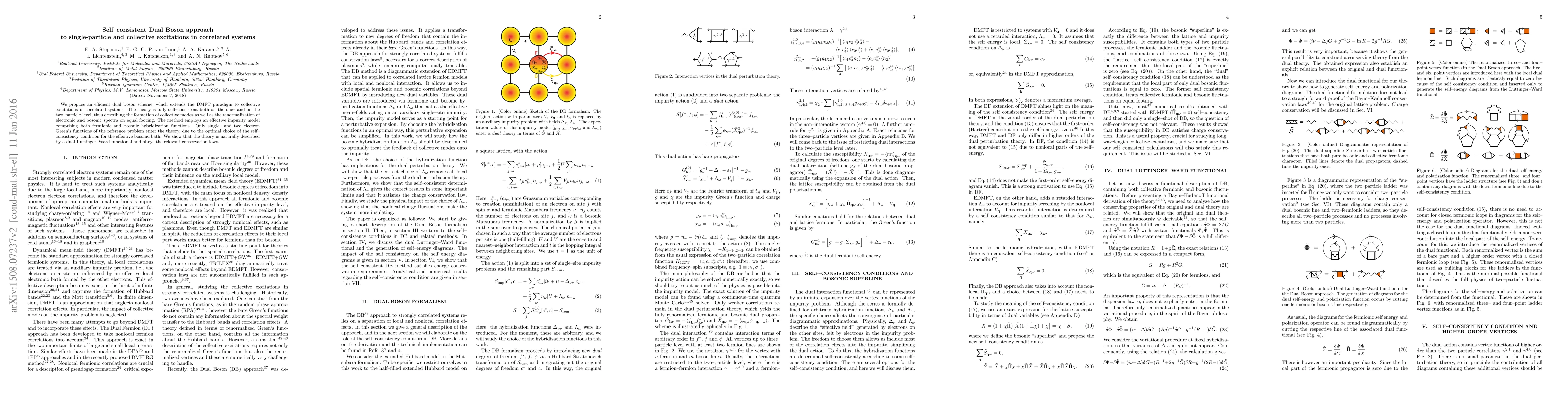 This paper proposes a self-consistent dual boson scheme extending the DMFT paradigm to describe collective excitations in correlated systems, providing a unified framework for both single-particle and collective modes. The method uses an effective impurity model with fermionic and bosonic hybridization, relying on single- and two-electron Green's functions.