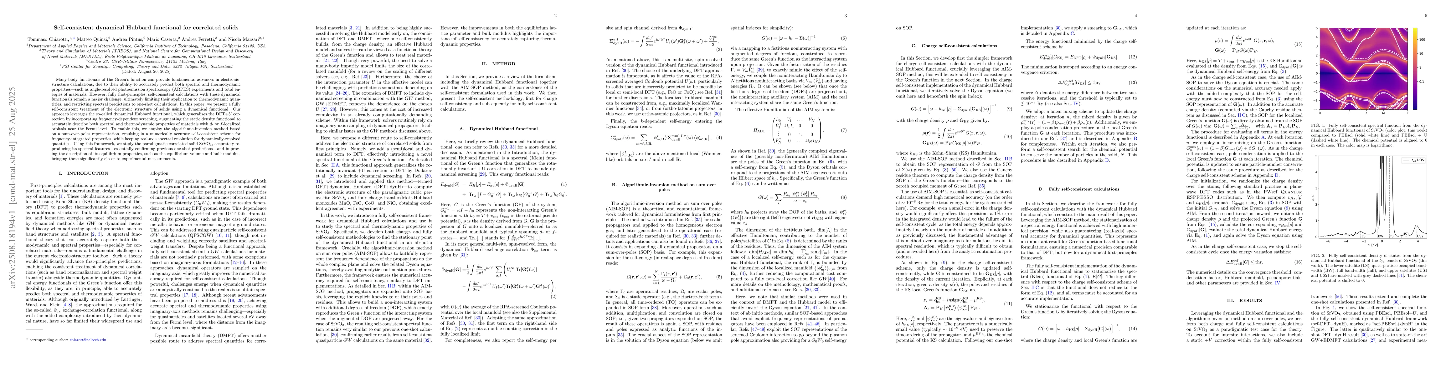 Many-body functionals of the Green's function can provide fundamental advances in electronic-structure calculations, due to their ability to accurately predict both spectral and thermodynamic properties, such as angle-resolved photoemission spectroscopy (ARPES) experiments and total energies of materials. However, fully first-principles, self-consistent calculations with these dynamical functionals remain a major challenge, ultimately limiting their application to thermodynamic quantities, and restricting spectral predictions to one-shot calculations. In this paper, we present a fully self-consistent treatment of the electronic structure of solids using a dynamical functional. Our approach leverages the so-called dynamical Hubbard functional, which generalizes the DFT+$U$ correction by incorporating frequency-dependent screening, augmenting the static density functional to accurately describe both spectral and thermodynamic properties of materials with $d$- or $f$-localized orbitals near the Fermi level. To enable this, we employ the algorithmic-inversion method based on a sum-over-poles representation, resulting in a numerically accurate self-consistent scheme for frequency-integrated properties, while keeping real-axis spectral resolution for dynamically-resolved quantities. Using this framework, we study the paradigmatic correlated solid SrVO$_3$, accurately reproducing its spectral features, essentially confirming previous one-shot predictions, and improving the description of its equilibrium properties, such as the equilibrium volume and bulk modulus, bringing these significantly closer to experimental measurements.