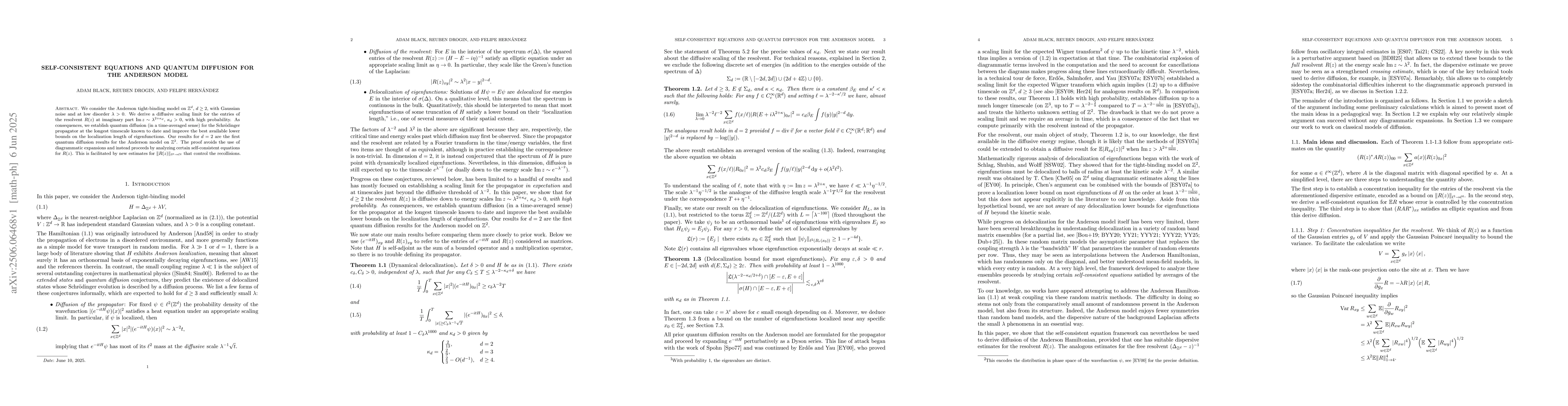 We consider the Anderson tight-binding model on $\mathbb{Z}^d$, $d\geq 2$, with Gaussian noise and at low disorder $\lambda>0$. We derive a diffusive scaling limit for the entries of the resolvent $R(z)$ at imaginary part $\operatorname*{Im} z\sim\lambda^{2+\kappa_d}$, $\kappa_d>0$, with high probability. As consequences, we establish quantum diffusion (in a time-averaged sense) for the Schr\"{o}dinger propagator at the longest timescale known to date and improve the best available lower bounds on the localization length of eigenfunctions. Our results for $d=2$ are the first quantum diffusion results for the Anderson model on $\mathbb{Z}^2$. The proof avoids the use of diagrammatic expansions and instead proceeds by analyzing certain self-consistent equations for $R(z)$. This is facilitated by new estimates for $\|R(z)\|_{\ell^p\rightarrow \ell^q}$ that control the recollisions.