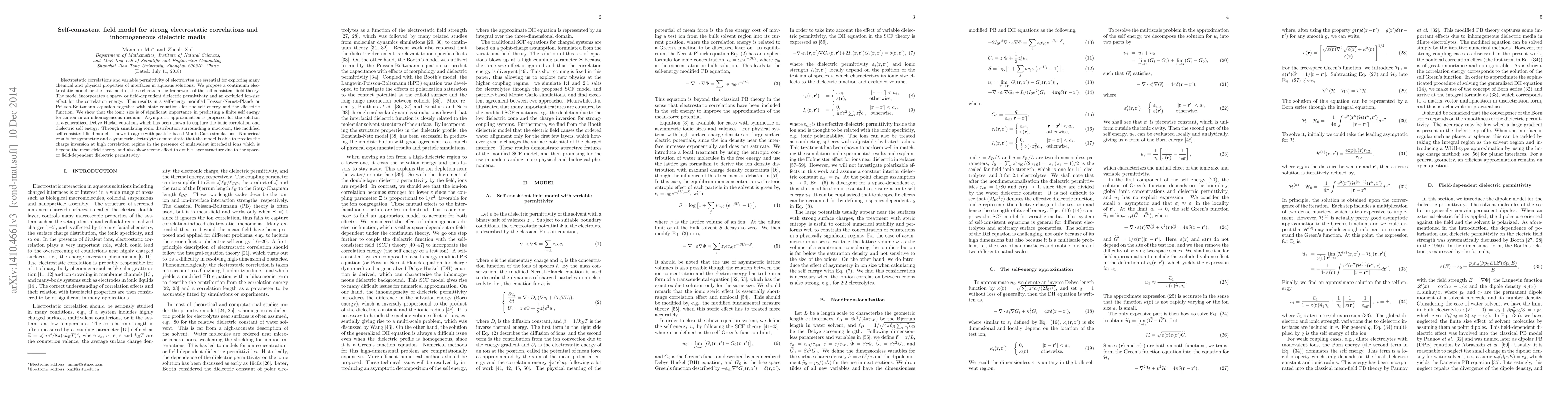 This paper proposes a self-consistent field model to address strong electrostatic correlations and variable permittivity in electrolytes, incorporating ion size effects. The model predicts finite self-energy for ions in inhomogeneous media and accurately captures charge inversion and double layer structures, surpassing mean-field predictions.