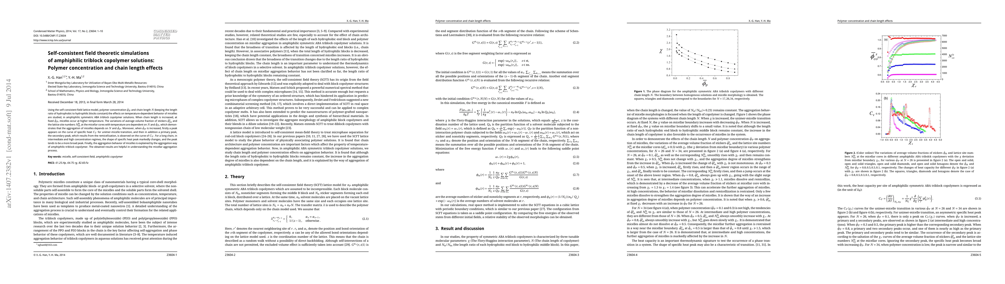 This paper uses self-consistent field lattice models to investigate how polymer concentration and chain length affect the temperature-dependent behavior of micelles in amphiphilic triblock copolymer solutions. Increasing chain length raises micelle formation temperature, while higher polymer concentration initially peaks and then shows a secondary peak in specific heat, indicating complex micelle aggregation behavior influenced by both concentration and chain length.