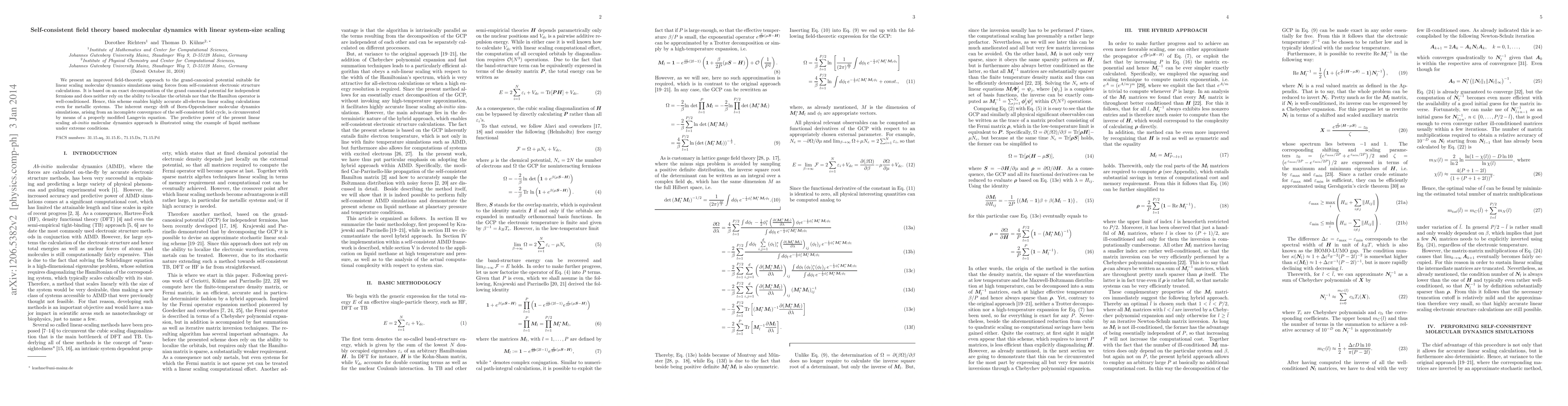 We present an improved field-theoretic approach to the grand-canonical potential suitable for linear scaling molecular dynamics simulations using forces from self-consistent electronic structure calculations. It is based on an exact decomposition of the grand canonical potential for independent fermions and does neither rely on the ability to localize the orbitals nor that the Hamilton operator is well-conditioned. Hence, this scheme enables highly accurate all-electron linear scaling calculations even for metallic systems. The inherent energy drift of Born-Oppenheimer molecular dynamics simulations, arising from an incomplete convergence of the self-consistent field cycle, is circumvented by means of a properly modified Langevin equation. The predictive power of the present linear scaling \textit{ab-initio} molecular dynamics approach is illustrated using the example of liquid methane under extreme conditions.