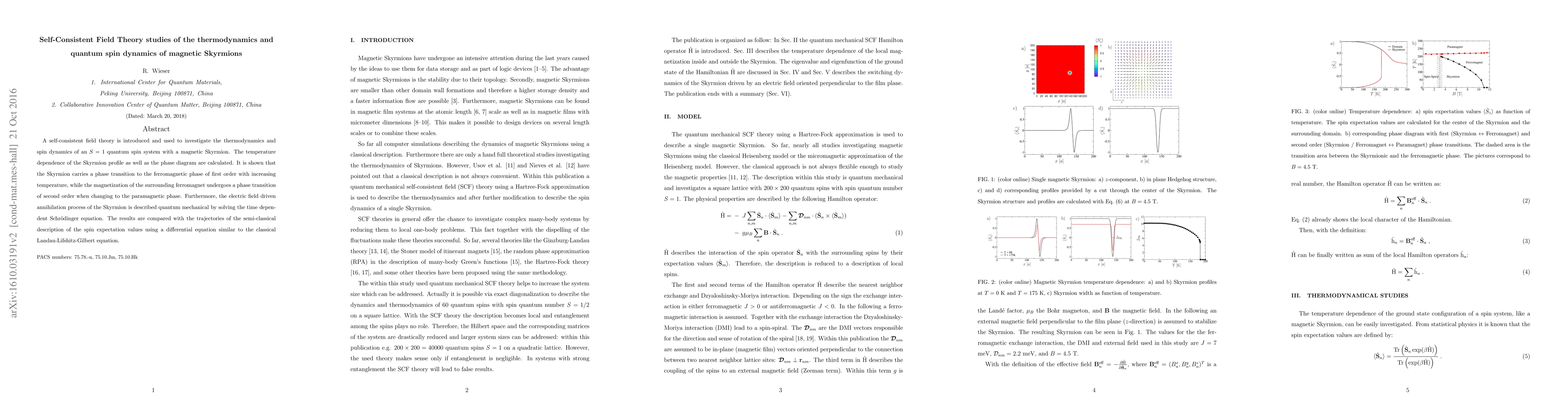 Researchers used a self-consistent field theory to study magnetic Skyrmions, finding that they undergo a first-order phase transition to ferromagnetism with increasing temperature. The theory also predicts an electric field-driven annihilation process for the Skyrmion.
