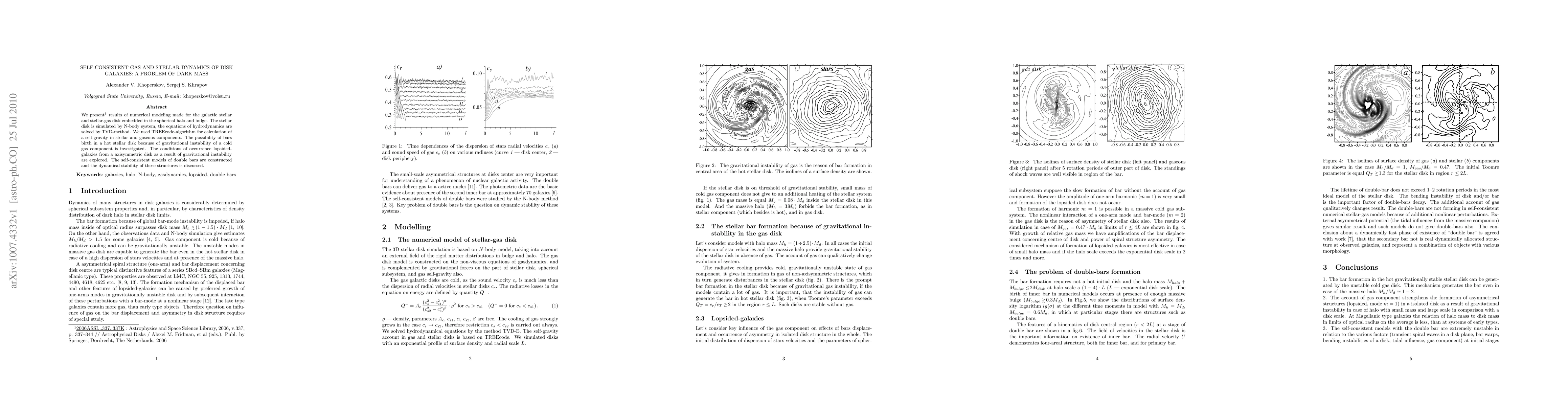 This paper presents numerical simulations of disk galaxies, focusing on the dynamics of stellar and gas disks within a spherical halo and bulge. It explores the formation of bars and lopsided structures due to gravitational instabilities, and constructs self-consistent models of double bars, discussing their dynamical stability.
