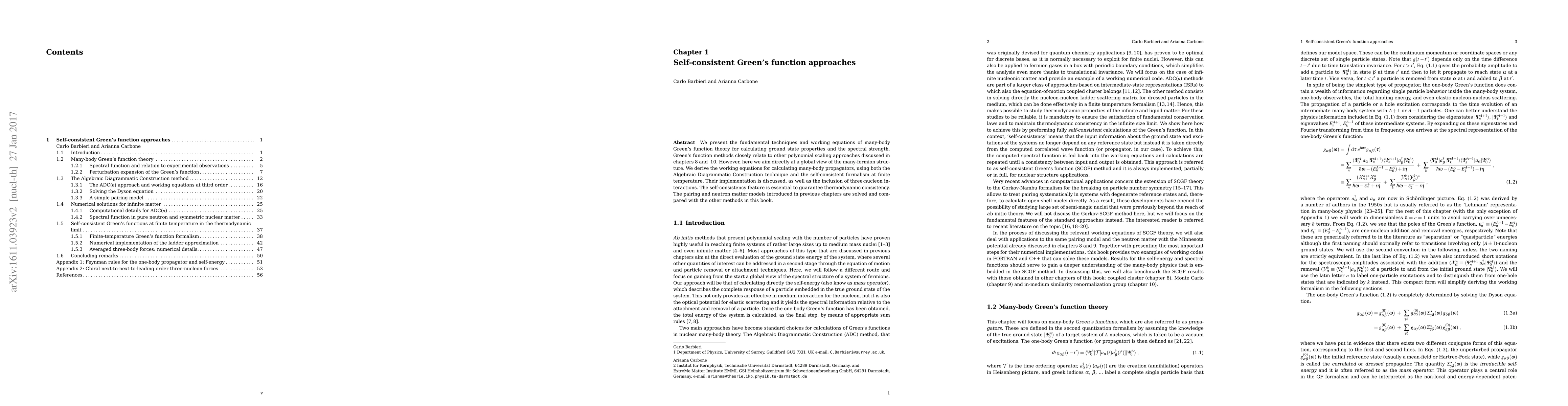 We present the fundamental techniques and working equations of many-body Green's function theory for calculating ground state properties and the spectral strength. Green's function methods closely relate to other polynomial scaling approaches discussed in chapters 8 and 10. However, here we aim directly at a global view of the many-fermion structure. We derive the working equations for calculating many-body propagators, using both the Algebraic Diagrammatic Construction technique and the self-consistent formalism at finite temperature. Their implementation is discussed, as well as the inclusion of three-nucleon interactions. The self-consistency feature is essential to guarantee thermodynamic consistency. The pairing and neutron matter models introduced in previous chapters are solved and compared with the other methods in this book.