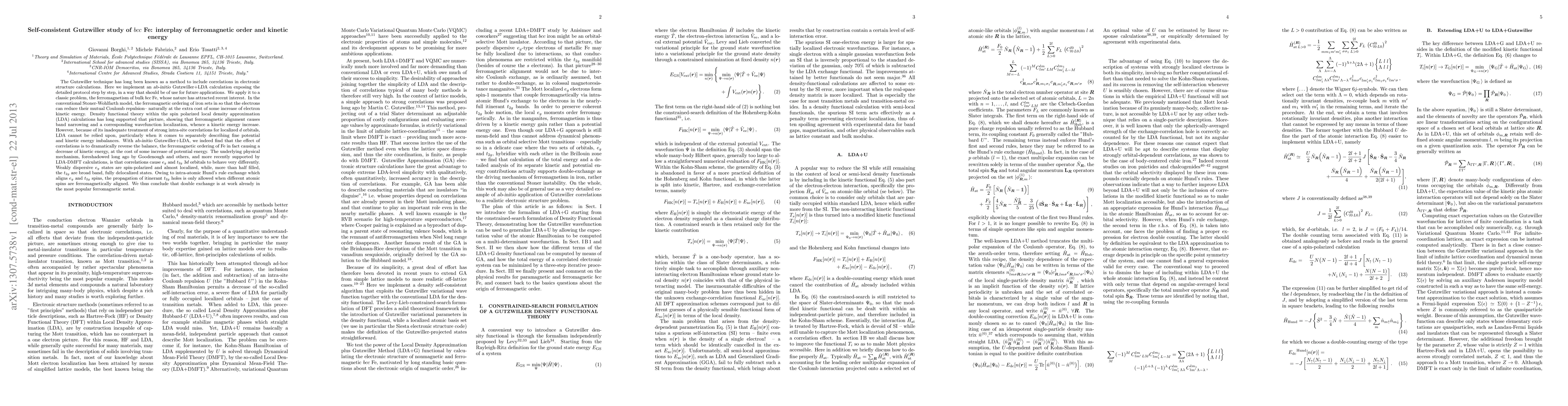 The Gutzwiller technique has long been known as a method to include correlations in electronic structure calculations. Here we implement an ab-initio Gutzwiller+LDA calculation, and apply it to a classic problem, the ferromagnetism of bulk bcc Fe, whose nature has attracted recent interest. In the conventional Stoner-Wohlfarth model, the ferromagnetic ordering of iron sets in so that the electrons can reduce their mutual Coulomb repulsion at the extra cost of some increase of electron kinetic energy. Density functional theory within the spin polarized local density approximation (LDA) has long supported that picture, showing that ferromagnetic alignment causes band narrowing and a corresponding wavefunction localization, whence a kinetic energy increase. However, because of its inadequate treatment of strong intra-site correlations for localized d orbitals, LDA cannot be relied upon, particularly when it comes to separately describing fine potential and kinetic energy imbalances. With ab-initio Gutzwiller+LDA, we indeed find that the effect of correlations is to dramatically reverse the balance, the ferromagnetic ordering of Fe in fact causing a decrease of kinetic energy, at the cost of some increase of potential energy. The underlying physical mechanism, foreshadowed long ago by Goodenough and others, and more recently supported by LDA+DMFT calculations, is that correlations cause eg and t2g 3d orbitals to behave very differently. Weakly dispersive eg states are spin-polarized and almost localized, while, more than half filled, the t2g are broad band, fully delocalized states. Owing to intra-atomic Hund's rule exchange which aligns eg and t2g spins, the propagation of itinerant t2g holes is only allowed when different atomic spins are ferromagnetically aligned. We thus conclude that double exchange is at work already in the most popular ferromagnetic metal.