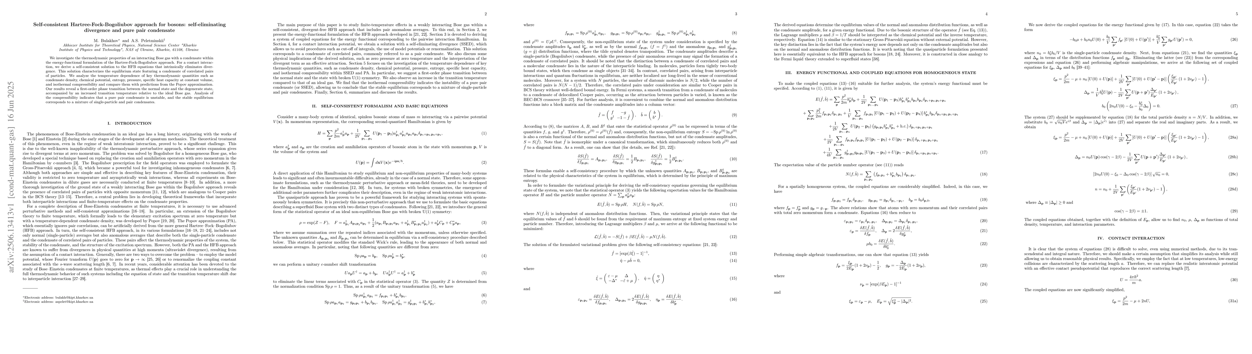 We investigate the thermodynamic properties of an interacting Bose gas with a condensate within the energy-functional formulation of the Hartree-Fock-Bogoliubov approach. For a contact interaction, we derive a self-consistent solution to the HFB equations that intrinsically eliminates divergence. This solution characterizes the equilibrium state featuring a condensate of correlated pairs of particles. We analyze the temperature dependence of key thermodynamic quantities such as condensate density, chemical potential, entropy, pressure, specific heat capacity at constant volume, and isothermal compressibility and compare them with predictions from the Popov approximation. Our results reveal a first-order phase transition between the normal state and the degenerate state, accompanied by an increased transition temperature relative to the ideal Bose gas. Analysis of the compressibility indicates that a pure pair condensate is unstable, and the stable equilibrium corresponds to a mixture of single-particle and pair condensates.