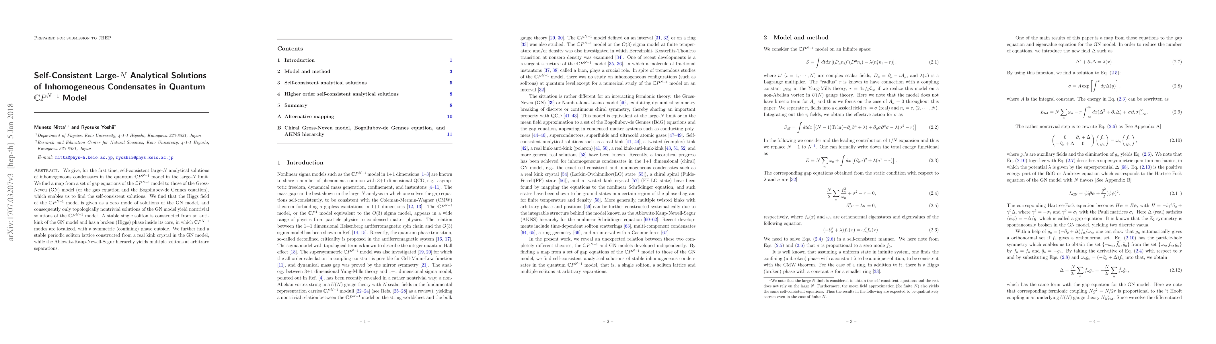 This paper presents the first self-consistent large-$N$ analytical solutions for inhomogeneous condensates in the quantum ${\mathbb C}P^{N-1}$ model, revealing a mapping to the Gross-Neveu model. It constructs stable solitons and soliton lattices, showing that nontrivial solutions arise from topologically nontrivial solutions of the Gross-Neveu model.