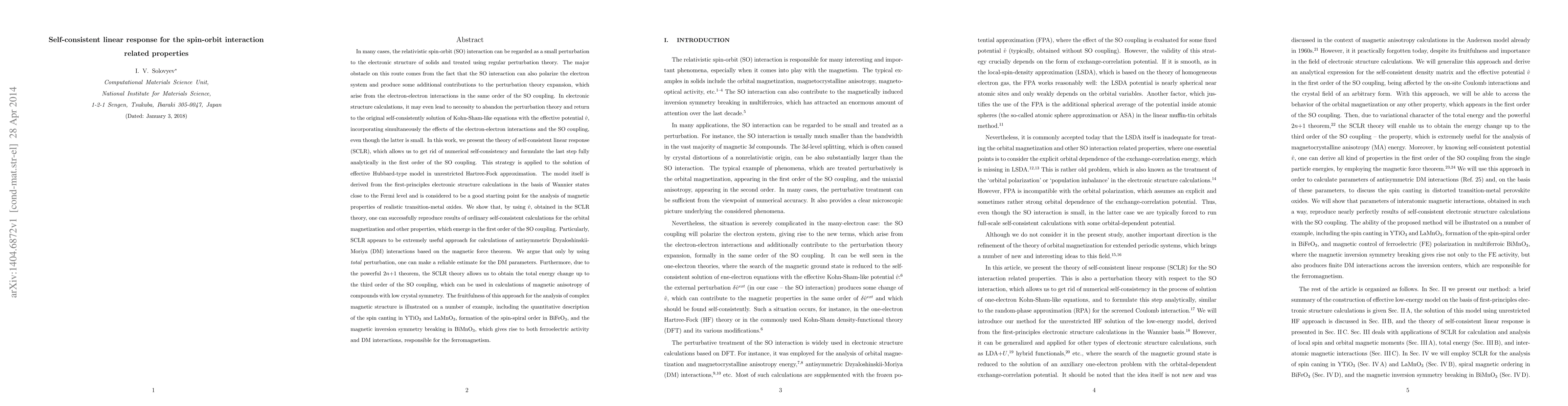 In many cases, the relativistic spin-orbit (SO) interaction is regarded to be small and can be treated using perturbation theory. The major obstacle on this route comes from the fact that the SO interaction can also polarize the electron system and produce additional contributions to the perturbation theory, arising from the electron-electron interactions. In electronic structure calculations, it may even lead to necessity to abandon the perturbation theory and return to the self-consistently solution of Kohn-Sham-like equations with the effective potential $\hat{v}$, incorporating the effects of the electron-electron interactions and the SO coupling, even though the latter is small. In this work, we present the theory of self-consistent linear response (SCLR), which allows us to get rid of numerical self-consistency and formulate it analytically in the first order of the SO coupling. This strategy is applied to the Hartree-Fock solution of the effective Hubbard model, derived from electronic structure calculations in the Wannier basis. By using $\hat{v}$, obtained from SCLR, one can successfully reproduce results of ordinary calculations for the orbital magnetization and other properties in the first order of the SO coupling. Particularly, SCLR appears to be extremely useful for calculations of antisymmetric Dzyaloshinskii-Moriya (DM) interactions based on the magnetic force theorem. Furthermore, due to the powerful 2n+1 theorem, the SCLR theory allows us to calculate the magnetic anisotropy energy up to the third order of the SO coupling. The fruitfulness of this approach is illustrated on a number of example, including the spin canting in YTiO$_3$ and LaMnO$_3$, formation of spiral magnetic order in BiFeO$_3$, and the magnetic inversion symmetry breaking in BiMnO$_3$, which gives rise to both ferroelectric activity and DM interactions, responsible for the ferromagnetism.