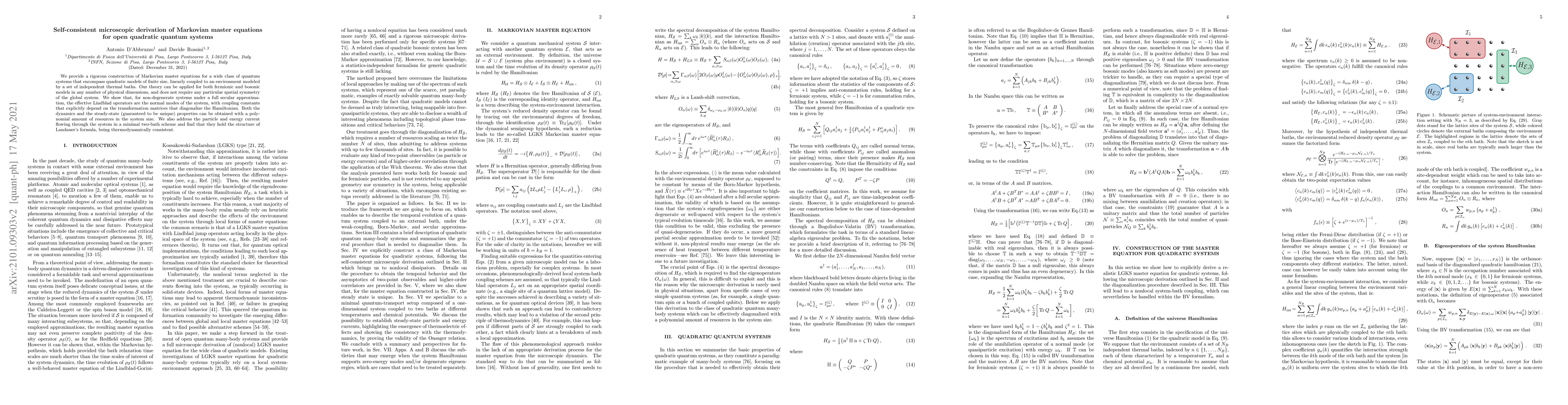 We provide a rigorous construction of Markovian master equations for a wide class of quantum systems that encompass quadratic models of finite size, linearly coupled to an environment modeled by a set of independent thermal baths. Our theory can be applied for both fermionic and bosonic models in any number of physical dimensions, and does not require any particular spatial symmetry of the global system. We show that, for non-degenerate systems under a full secular approximation, the effective Lindblad operators are the normal modes of the system, with coupling constants that explicitly depend on the transformation matrices that diagonalize the Hamiltonian. Both the dynamics and the steady-state (guaranteed to be unique) properties can be obtained with a polynomial amount of resources in the system size. We also address the particle and energy current flowing through the system in a minimal two-bath scheme and find that they hold the structure of Landauer's formula, being thermodynamically consistent.