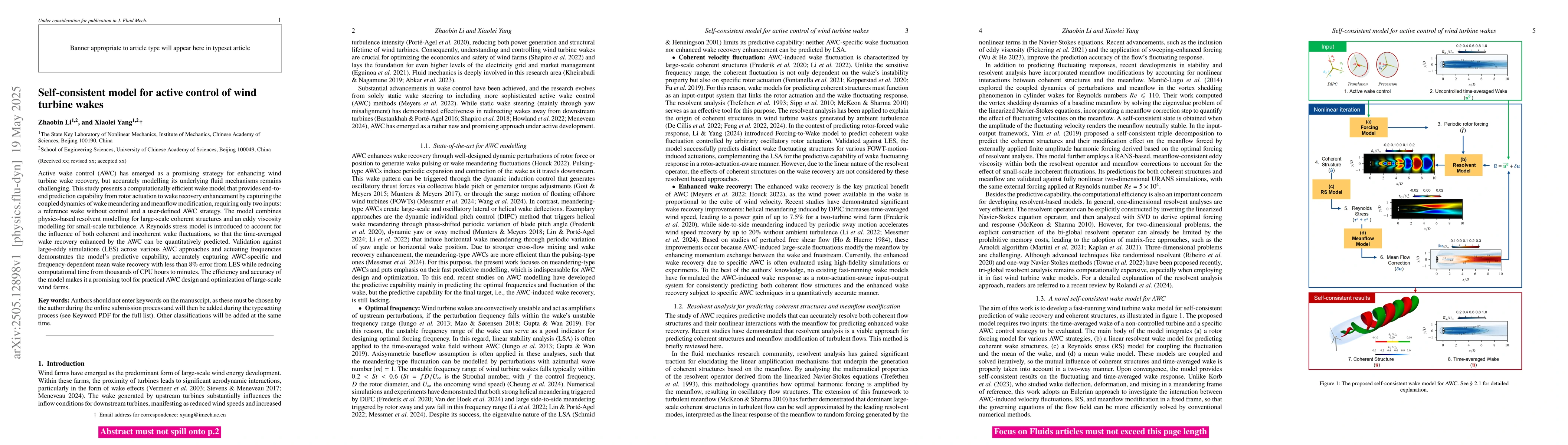 The study develops a computationally efficient wake model for active wake control (AWC) in wind turbines, combining physics-based resolvent modelling for large-scale coherent structures and eddy viscosity modelling for small-scale turbulence, along with a Reynolds stress model to account for coherent and incoherent wake fluctuations.