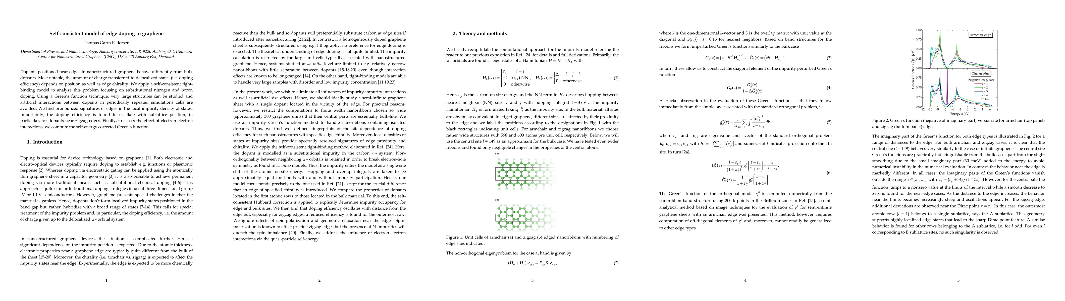 Dopants positioned near edges in nanostructured graphene behave differently from bulk dopants. Most notable, the amount of charge transferred to delocalized states (i.e. doping efficiency) depends on position as well as edge chirality. We apply a self-consistent tight-binding model to analyze this problem focusing on substitutional nitrogen and boron doping. Using a Greens function technique, very large structures can be studied and artificial interactions between dopants in periodically repeated simulations cells are avoided. We find pronounced signatures of edges in the local impurity density of states. Importantly, the doping efficiency is found to oscillate with sublattice position, in particular, for dopants near zigzag edges. Finally, to assess the effect of electron-electron interactions, we compute the self-energy corrected Greens function.