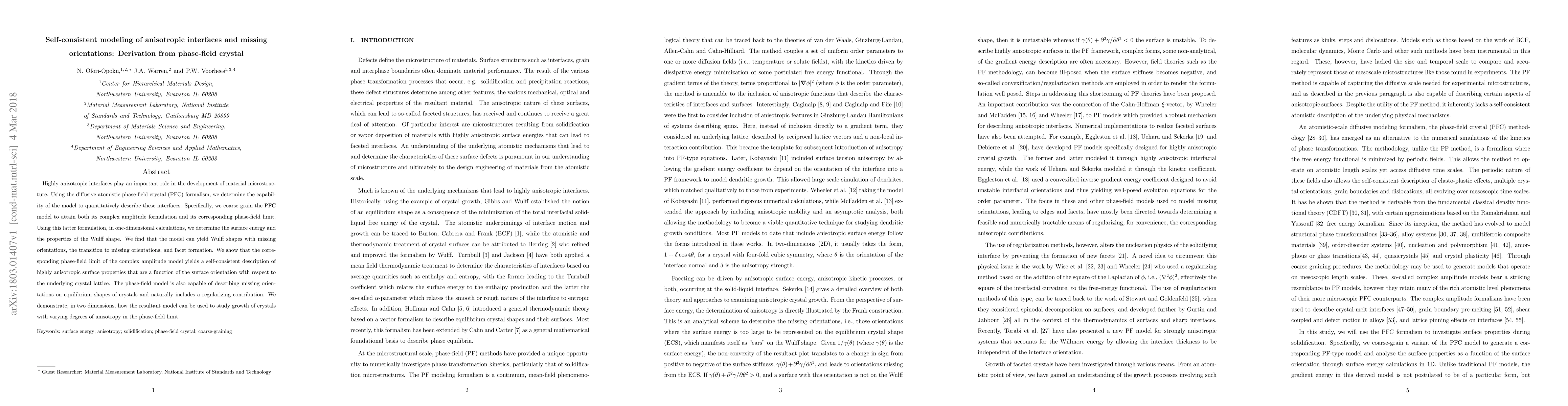 This paper uses the phase-field crystal formalism to model highly anisotropic interfaces, deriving a self-consistent description of surface properties and missing orientations. The model successfully captures the transition to missing orientations and facet formation, and it can describe the growth of crystals with varying degrees of anisotropy.