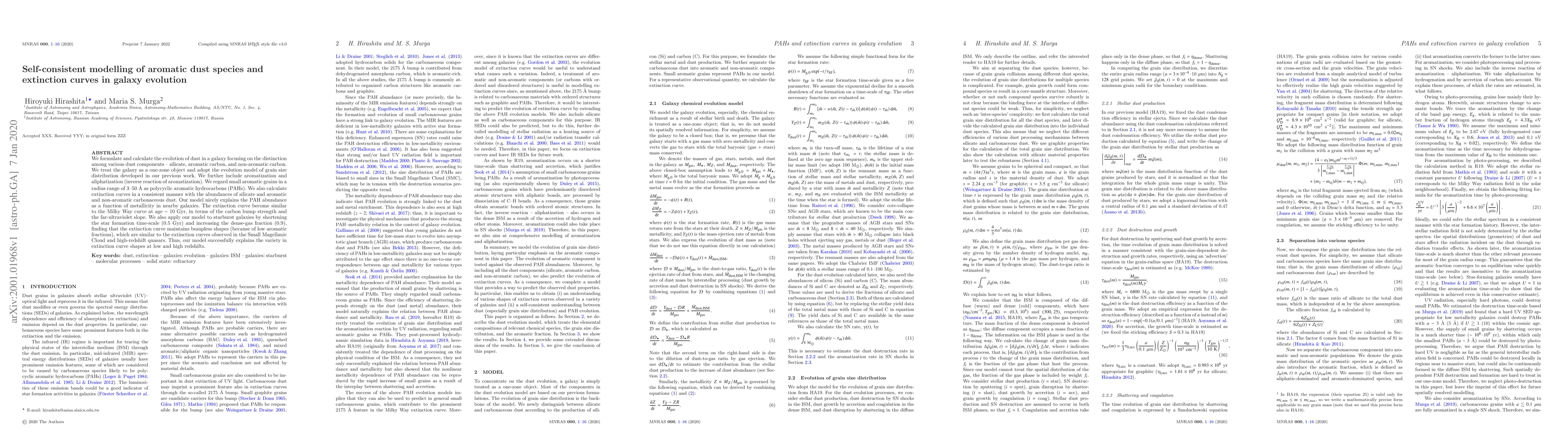 This paper develops a self-consistent model to track the evolution of different dust components in a galaxy, including silicate, aromatic carbon, and non-aromatic carbon. The study explains the PAH abundance and extinction curves, showing that the model can replicate Milky Way-like curves after 10 Gyr and maintain bumpless shapes in starburst galaxies, akin to observations in the Small Magellanic Cloud and high-redshift quasars.