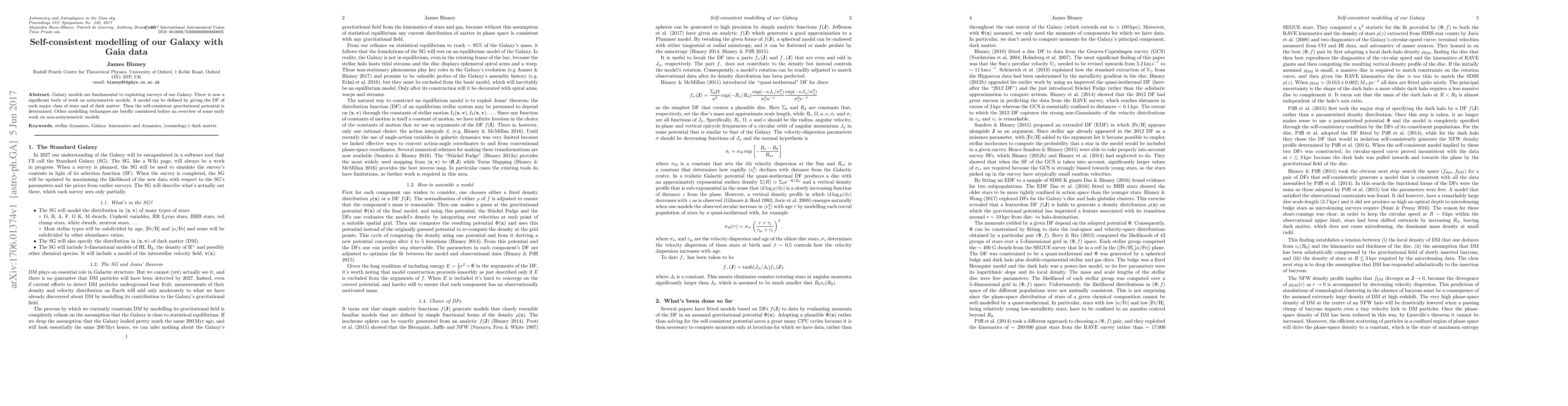 Galaxy models are fundamental to exploiting surveys of our Galaxy. There is now a significant body of work on axisymmetric models. A model can be defined by giving the DF of each major class of stars and of dark matter. Then the self-consistent gravitational potential is determined. Other modelling techniques are briefly considered before an overview of some early work on non-axisymmetric models.