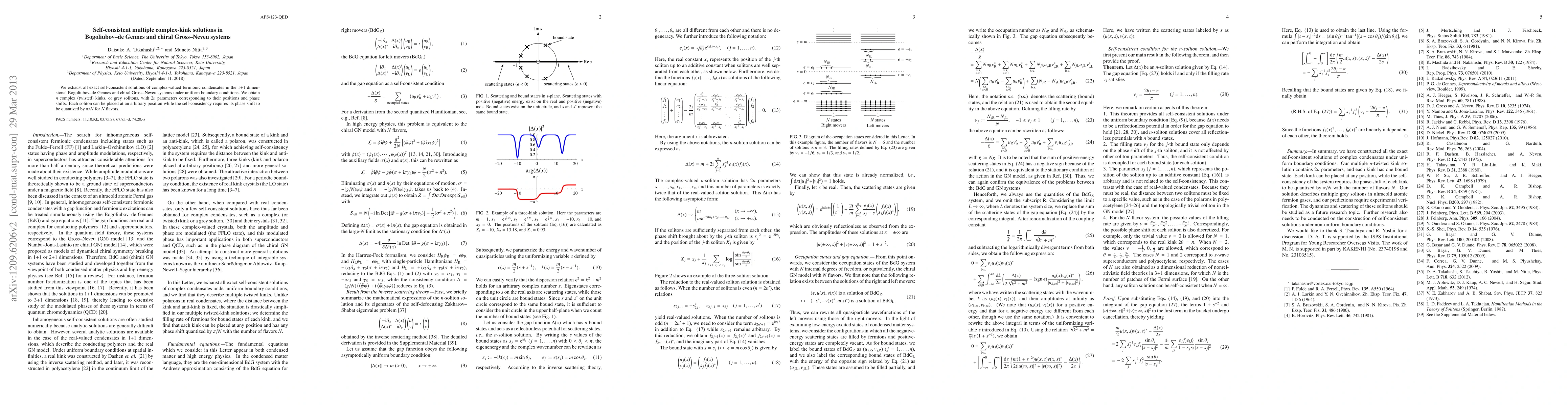 We exhaust all exact self-consistent solutions of complex-valued fermionic condensates in the 1+1 dimensional Bogoliubov-de Gennes and chiral Gross-Neveu systems under uniform boundary conditions. We obtain $n$ complex (twisted) kinks, or grey solitons, with $2n$ parameters corresponding to their positions and phase shifts. Each soliton can be placed at an arbitrary position while the self-consistency requires its phase shift to be quantized by $\pi/N$ for $N$ flavors.