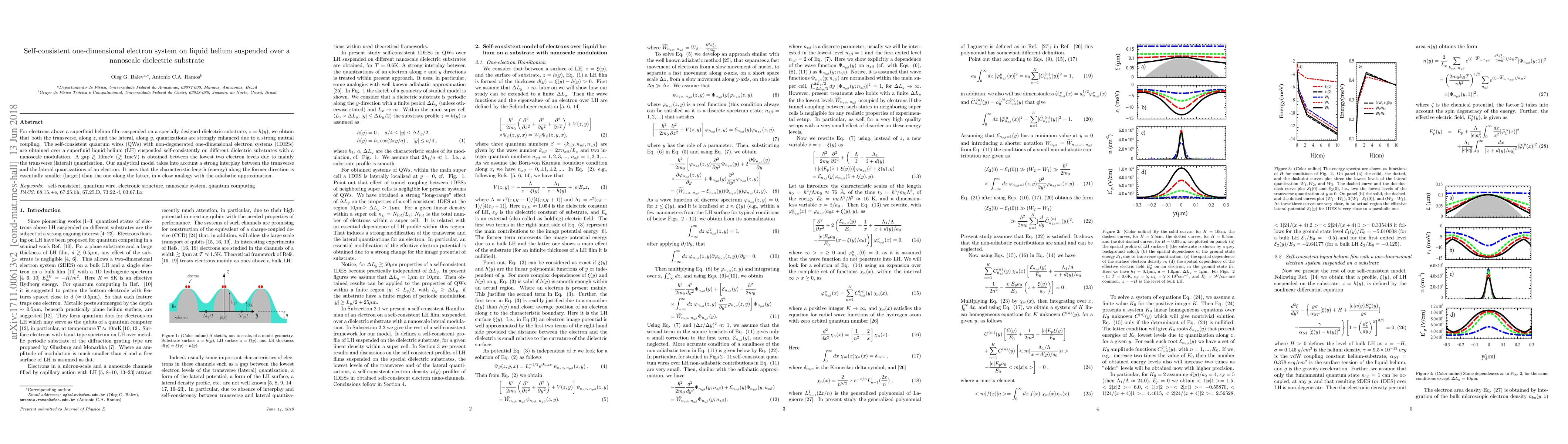 This paper investigates self-consistent one-dimensional electron systems formed above superfluid helium on nanoscale dielectric substrates, revealing strong coupling enhancing both transverse and lateral quantizations. The model predicts a gap of approximately 10 meV due to the interplay between these quantizations, with the analytical approach considering the differing characteristic lengths and energies along each direction.