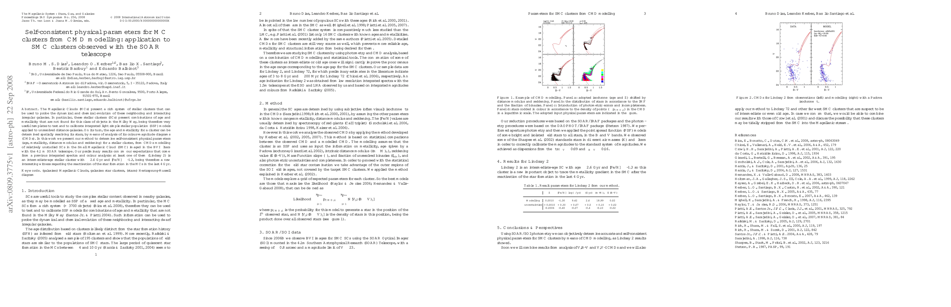 This paper presents a method for determining self-consistent physical parameters of stellar clusters in the Small Magellanic Cloud (SMC) using color-magnitude diagram (CMD) modeling with SOAR telescope data. Preliminary results indicate that at least one cluster, Lindsay 2, is an intermediate-age cluster (~2.6 Gyr) with a metallicity of [Fe/H] ~ -1.3, suggesting recent star formation activity in the Magellanic Clouds.