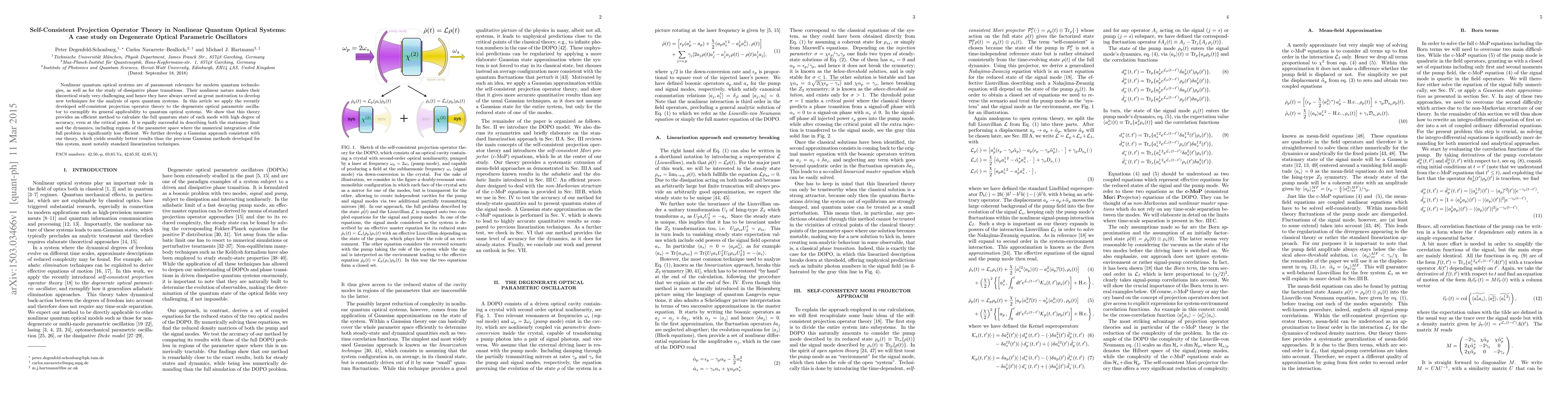 This paper applies self-consistent projection operator theory to degenerate optical parametric oscillators, demonstrating its effectiveness in accurately calculating the full quantum state, especially near critical points. The developed Gaussian approach outperforms previous methods, highlighting the theory's broad applicability in nonlinear quantum optical systems.