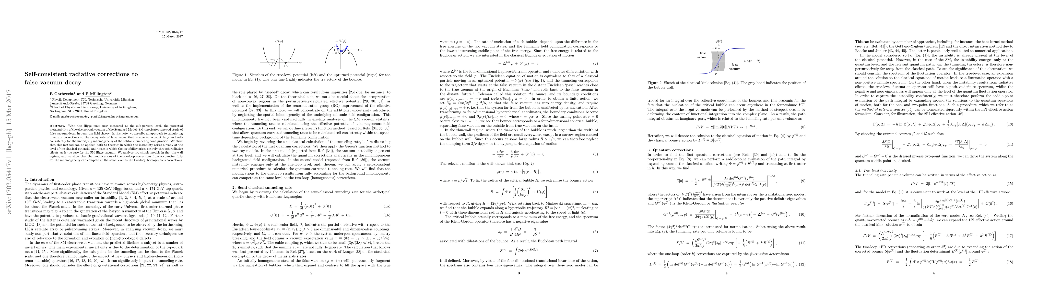 This paper presents a method for calculating quantum corrections to the decay rate of false vacua in quantum field theory, focusing on the electroweak vacuum's metastability. It demonstrates that the self-consistent approach can account for the inhomogeneity of the solitonic tunneling configuration, showing significant modifications to one-loop corrections comparable to two-loop homogeneous corrections.