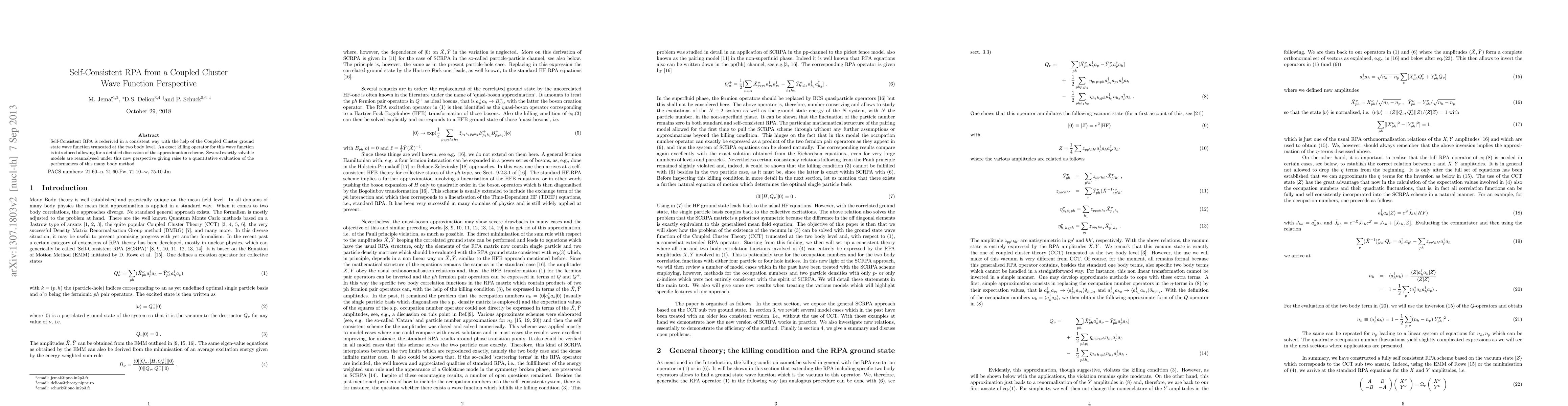 This paper rederives Self-Consistent RPA using the Coupled Cluster wave function truncated at the two-body level, introducing an exact killing operator for detailed approximation analysis. It evaluates the method's performance through quantitative analysis of several exactly solvable models.