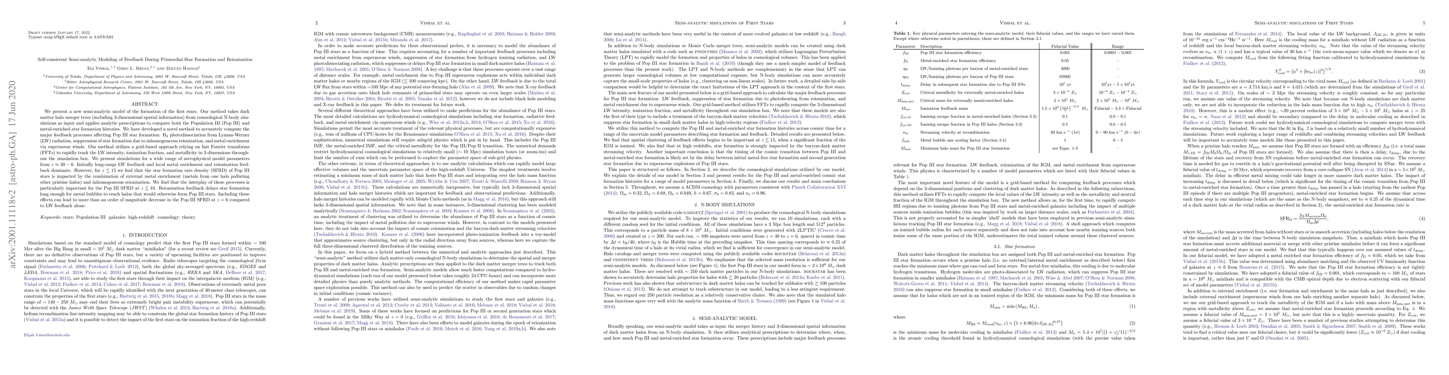 We present a new semi-analytic model of the formation of the first stars. Our method takes dark matter halo merger trees (including 3-dimensional spatial information) from cosmological N-body simulations as input and applies analytic prescriptions to compute both the Population III (Pop III) and metal-enriched star formation histories. We have developed a novel method to accurately compute the major feedback processes affecting Pop III star formation: H$_2$ photodissociation from Lyman-Werner (LW) radiation, suppression of star formation due to inhomogeneous reionization, and metal enrichment via supernovae winds. Our method utilizes a grid-based approach relying on fast Fourier transforms (FFTs) to rapidly track the LW intensity, ionization fraction, and metallicity in 3-dimensions throughout the simulation box. We present simulations for a wide range of astrophysical model parameters from $z\approx 30-6$. Initially long-range LW feedback and local metal enrichment and reionization feedback dominate. However, for $z \lesssim 15$ we find that the star formation rate density (SFRD) of Pop III stars is impacted by the combination of external metal enrichment (metals from one halo polluting other pristine halos) and inhomogeneous reionization. We find that the interplay of these processes is particularly important for the Pop III SFRD at $z \lesssim 10$. Reionization feedback delays star formation long enough for metal bubbles to reach halos that would otherwise form Pop III stars. Including these effects can lead to more than an order of magnitude decrease in the Pop III SFRD at $z=6$ compared to LW feedback alone.