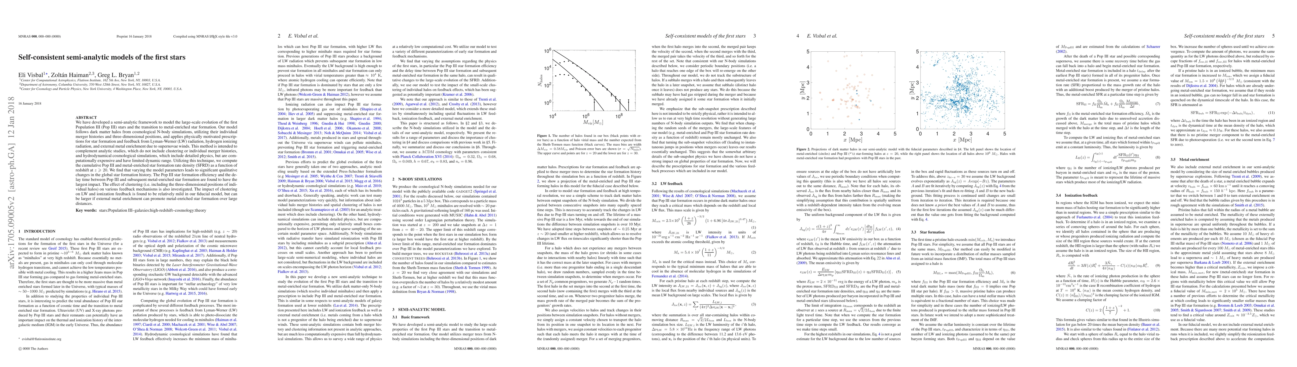 We have developed a semi-analytic framework to model the large-scale evolution of the first Population III (Pop III) stars and the transition to metal-enriched star formation. Our model follows dark matter halos from cosmological N-body simulations, utilizing their individual merger histories and three-dimensional positions, and applies physically motivated prescriptions for star formation and feedback from Lyman-Werner (LW) radiation, hydrogen ionizing radiation, and external metal enrichment due to supernovae winds. This method is intended to complement analytic studies, which do not include clustering or individual merger histories, and hydrodynamical cosmological simulations, which include detailed physics, but are computationally expensive and have limited dynamic range. Utilizing this technique, we compute the cumulative Pop III and metal-enriched star formation rate density (SFRD) as a function of redshift at $z \geq 20$. We find that varying the model parameters leads to significant qualitative changes in the global star formation history. The Pop III star formation efficiency and the delay time between Pop III and subsequent metal-enriched star formation are found to have the largest impact. The effect of clustering (i.e. including the three-dimensional positions of individual halos) on various feedback mechanisms is also investigated. The impact of clustering on LW and ionization feedback is found to be relatively mild in our fiducial model, but can be larger if external metal enrichment can promote metal-enriched star formation over large distances.