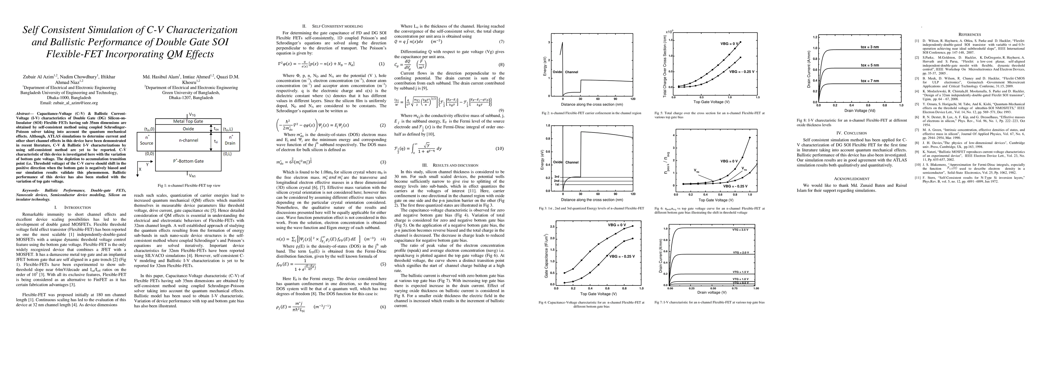 Capacitance-Voltage (C-V) & Ballistic Current- Voltage (I-V) characteristics of Double Gate (DG) Silicon-on- Insulator (SOI) Flexible FETs having sub 35nm dimensions are obtained by self-consistent method using coupled Schrodinger- Poisson solver taking into account the quantum mechanical effects. Although, ATLAS simulations to determine current and other short channel effects in this device have been demonstrated in recent literature, C-V & Ballistic I-V characterizations by using self-consistent method are yet to be reported. C-V characteristic of this device is investigated here with the variation of bottom gate voltage. The depletion to accumulation transition point (i.e. Threshold voltage) of the C-V curve should shift in the positive direction when the bottom gate is negatively biased and our simulation results validate this phenomenon. Ballistic performance of this device has also been studied with the variation of top gate voltage.