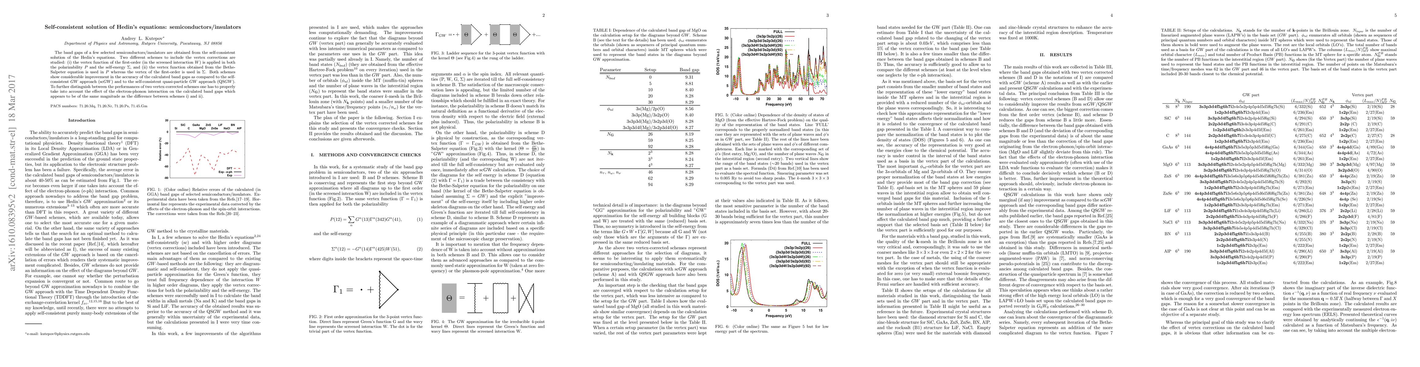 The band gaps of a few selected semiconductors/insulators are obtained from the self-consistent solution of the Hedin's equations. Two different schemes to include the vertex corrections are studied: (i) the vertex function of the first-order (in the screened interaction $W$) is applied in both the polarizability $P$ and the self-energy $\Sigma$, and (ii) the vertex function obtained from the Bethe-Salpeter equation is used in $P$ whereas the vertex of the first-order is used in $\Sigma$. Both schemes show considerable improvement in the accuracy of the calculated band gaps as compared to the self-consistent $GW$ approach (sc$GW$) and to the self-consistent quasi-particle $GW$ approach (QS$GW$). To further distinguish between the performances of two vertex-corrected schemes one has to properly take into account the effect of the electron-phonon interaction on the calculated band gaps which appears to be of the same magnitude as the difference between schemes i) and ii).